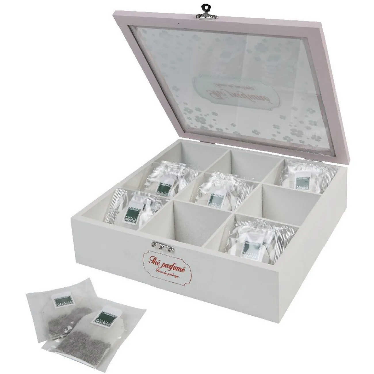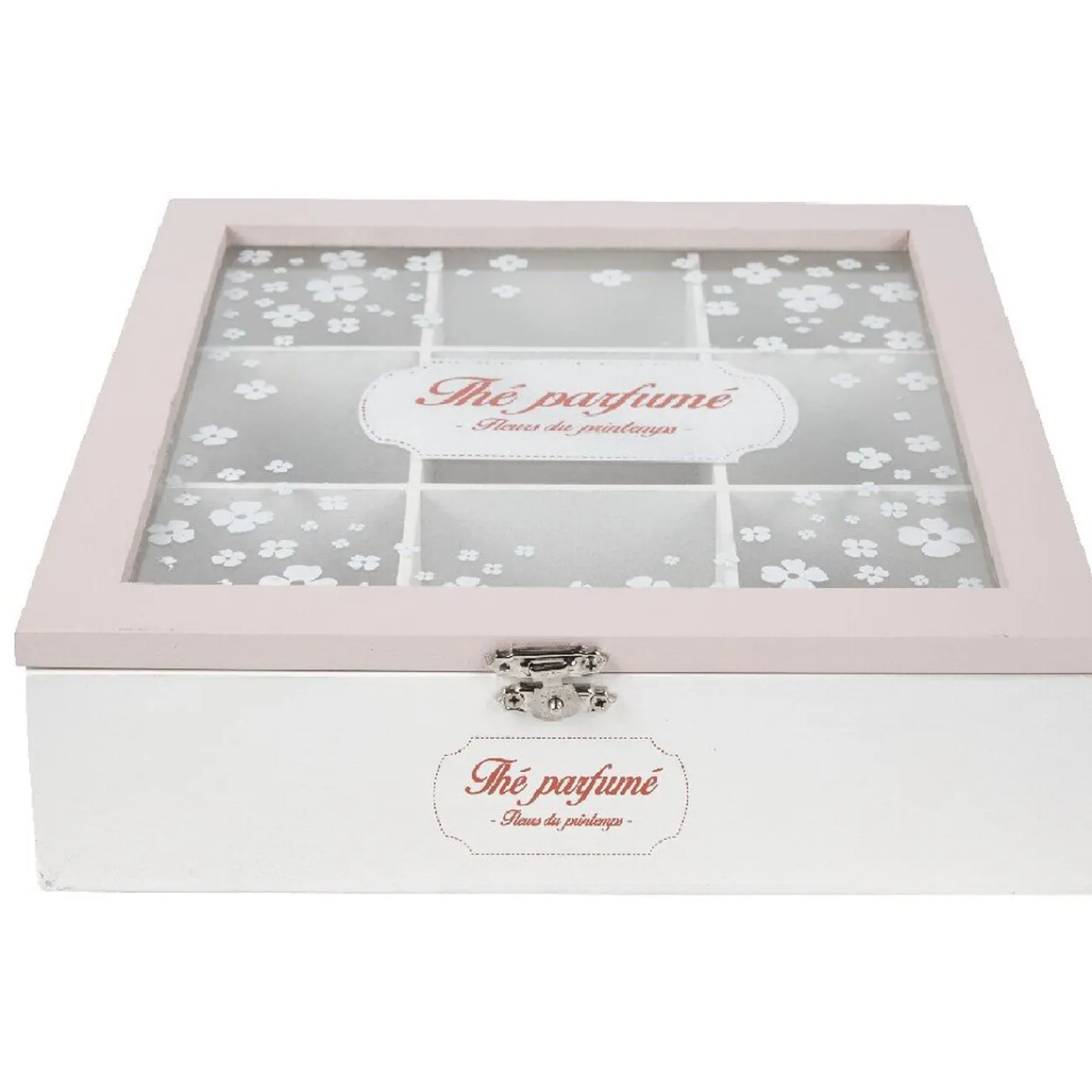 Boîte à thé rose et blanche, motif fleur de cerisier, 9 compartiments.