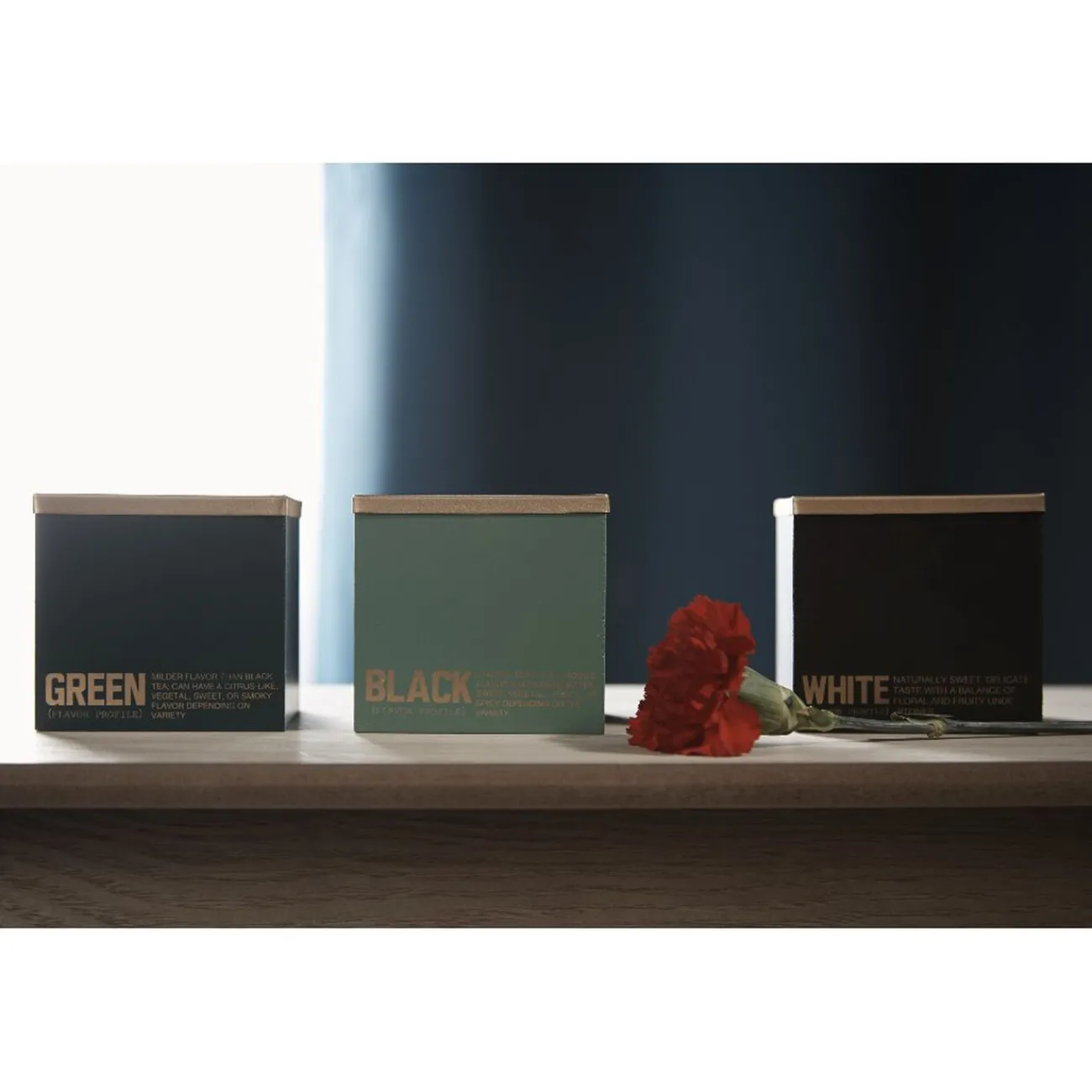 Lot de 3 boîtes à thé avec inscription en doré pour bien les identifier « GREEN / BLACK / WHITE ».