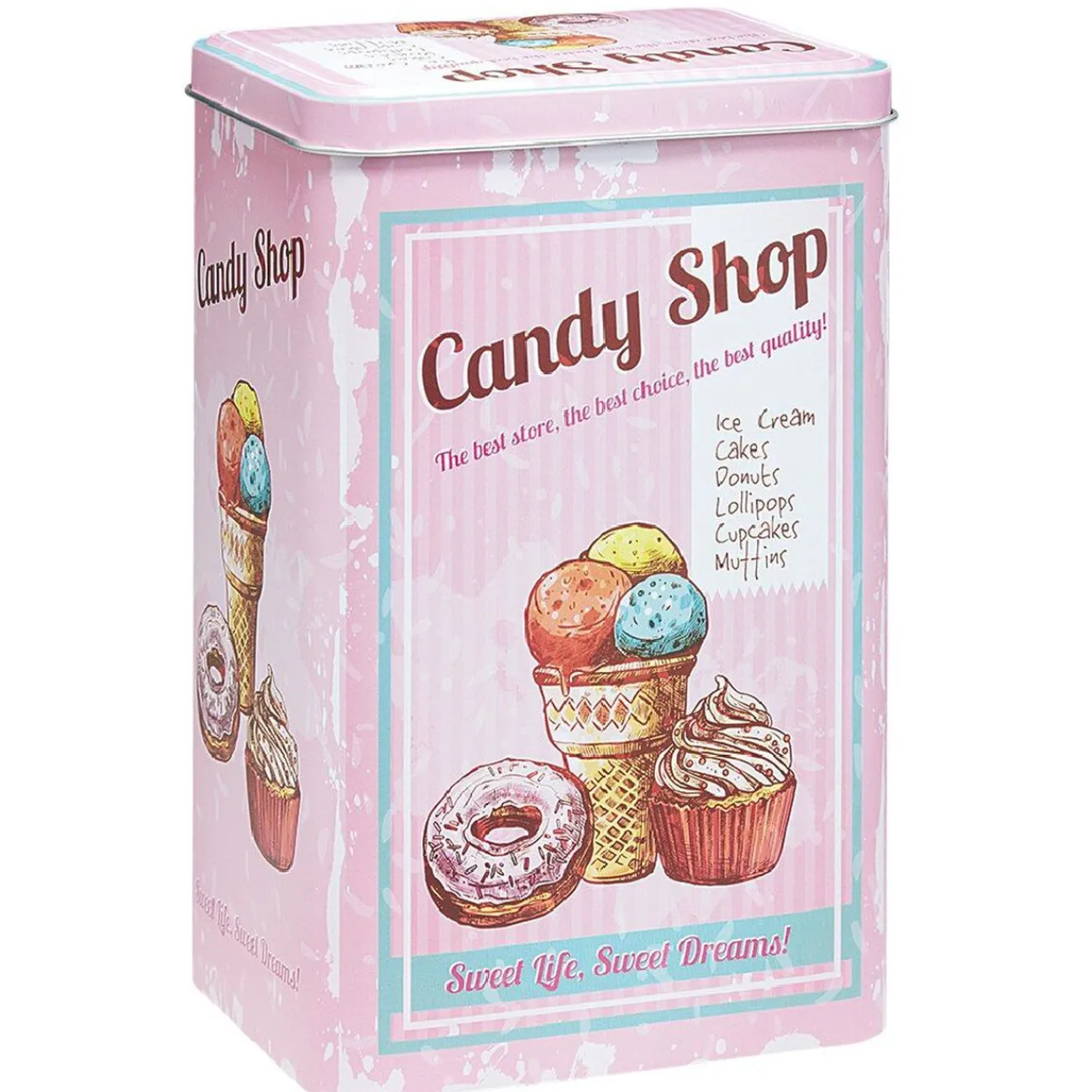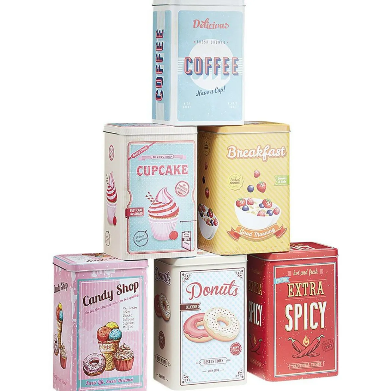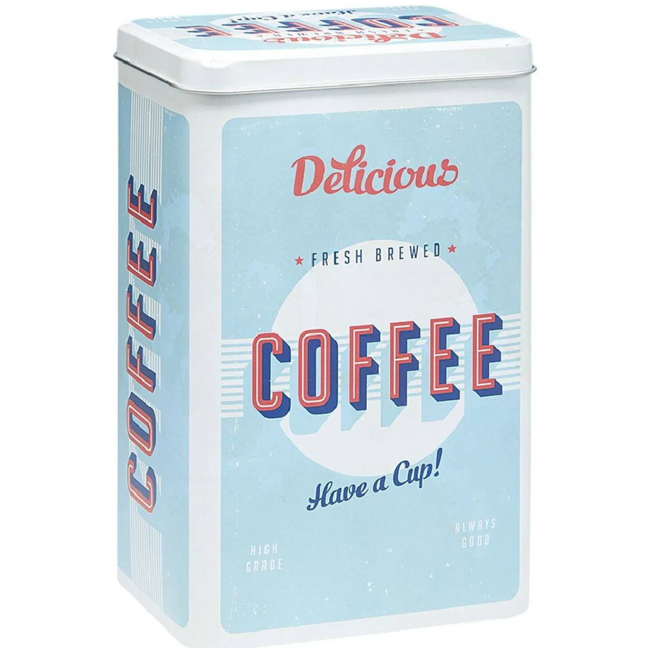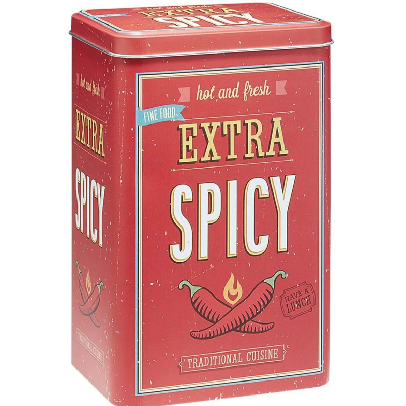 Boîte alimentaire en métal avec inscriptions et motifs sur le thème de la cuisine.