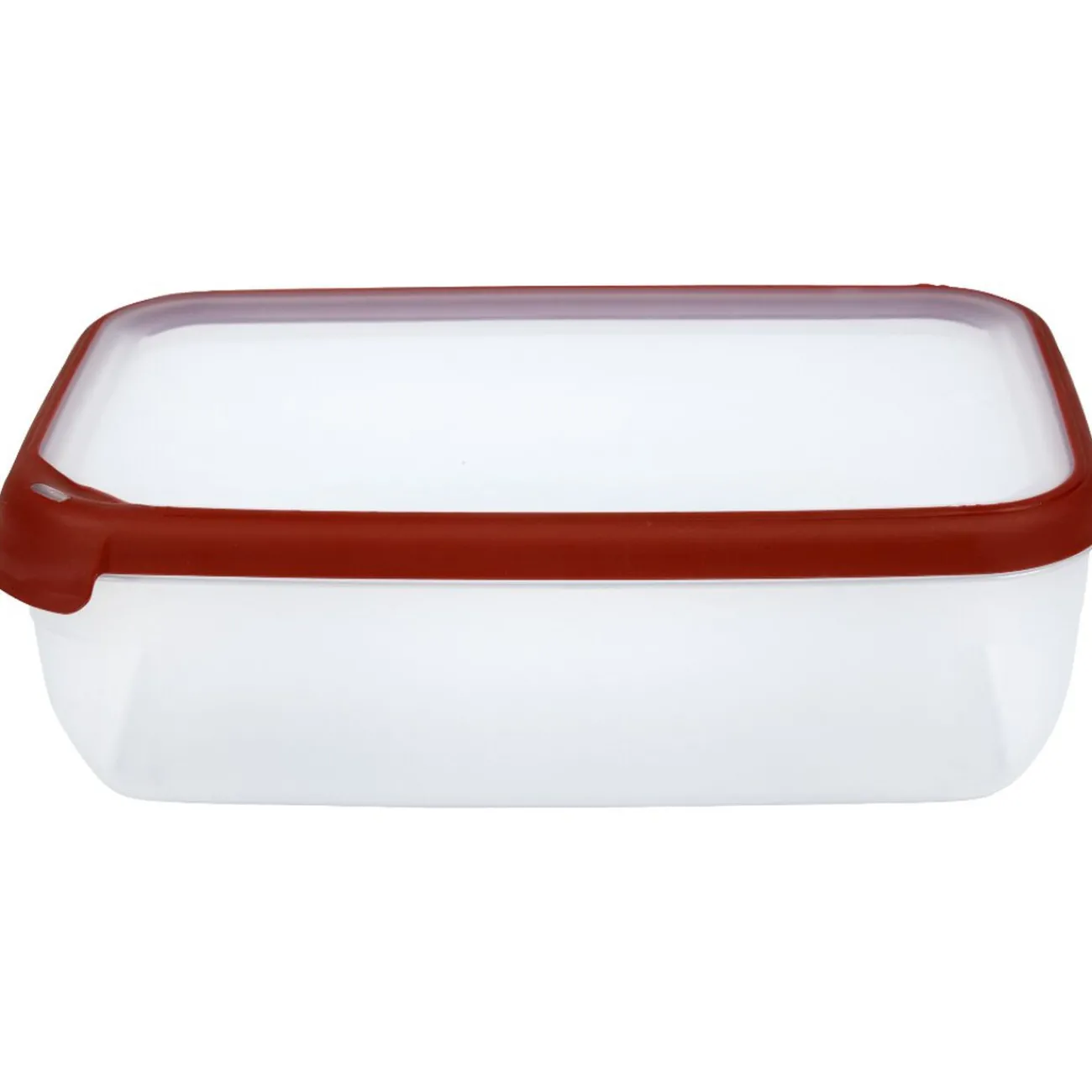 Conservez hermétiquement vos aliments avec cette boîte transparente et rouge.