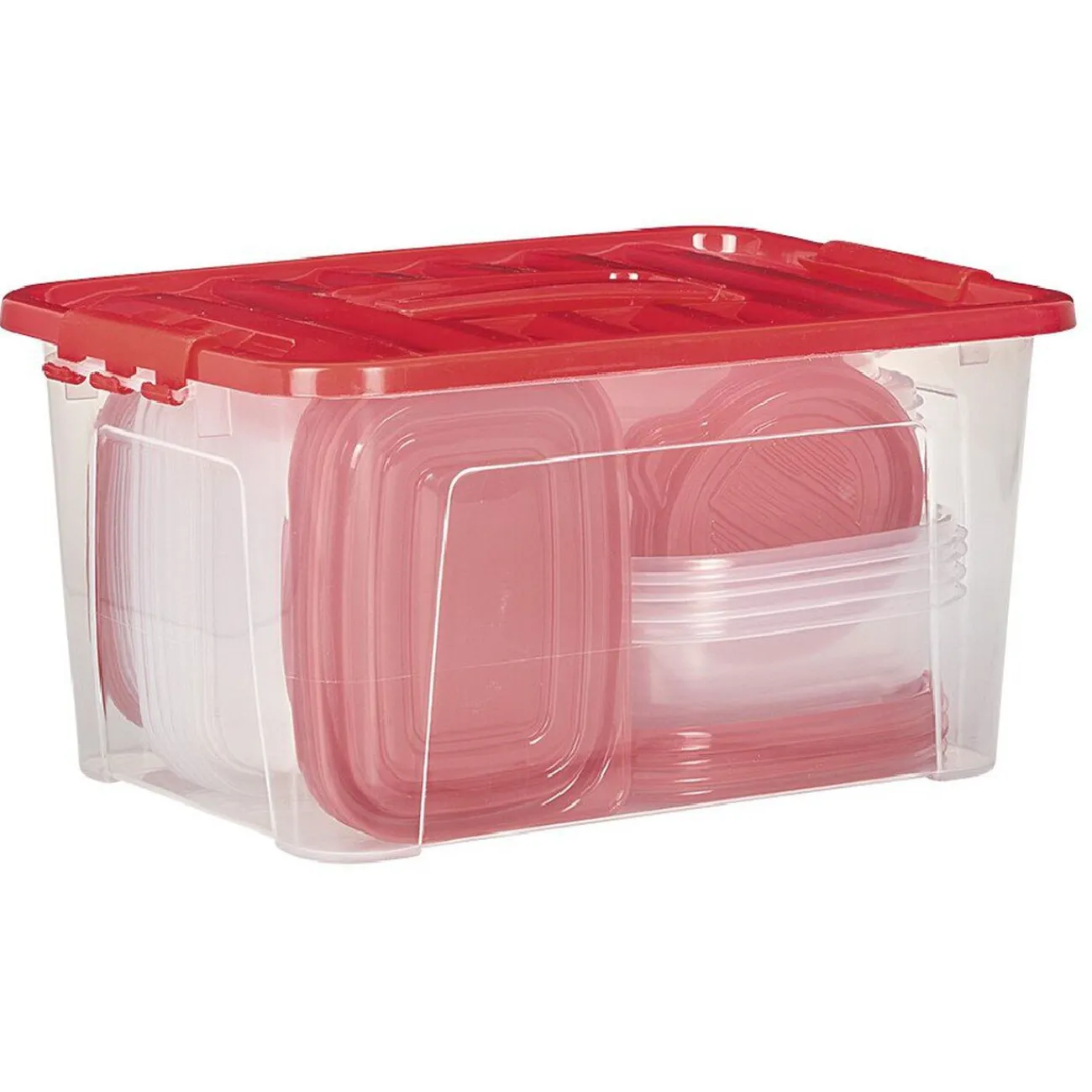 Lot de 27 boîtes alimentaires transparentes avec couvercles rouge ou bleu. Coloris aléatoires selon disponibilité en stock magasin.