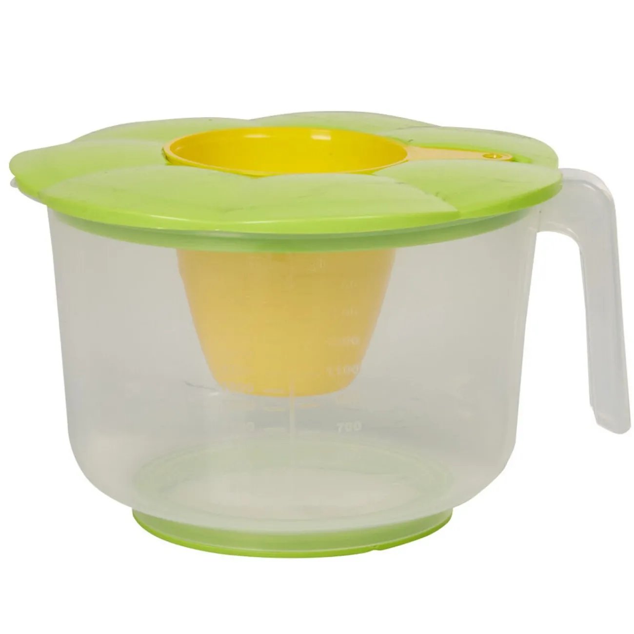 Bol doseur transparent avec couvercle et gobelet intégré jaune et vert.