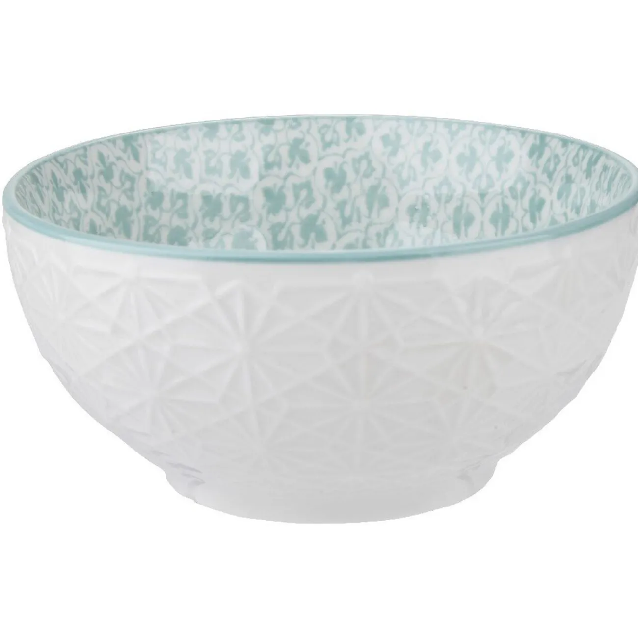 Lot de 4 japonais en porcelaine avec motifs géométriques similaires et couleurs pastels différentes pour chacun des bols : un rouge, un vert, un bleu, un jaune.