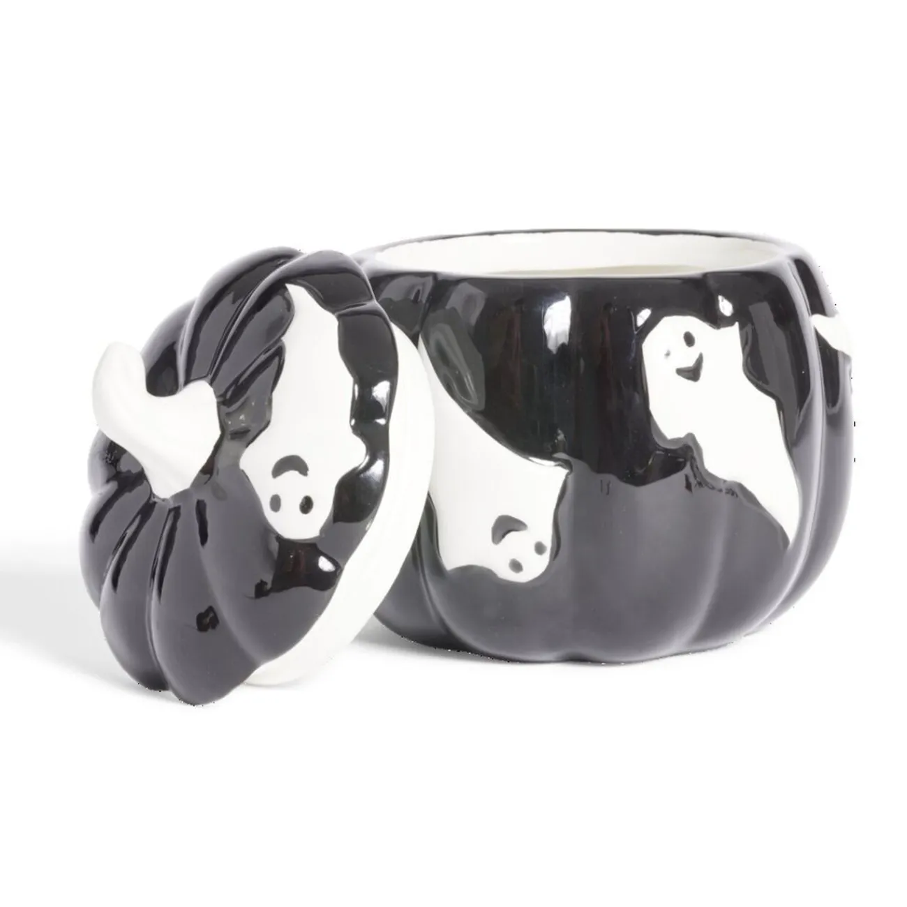 Capturez l’esprit d’Halloween avec cette bonbonnière en forme de citrouille noire agrémentée de fantômes blancs.
