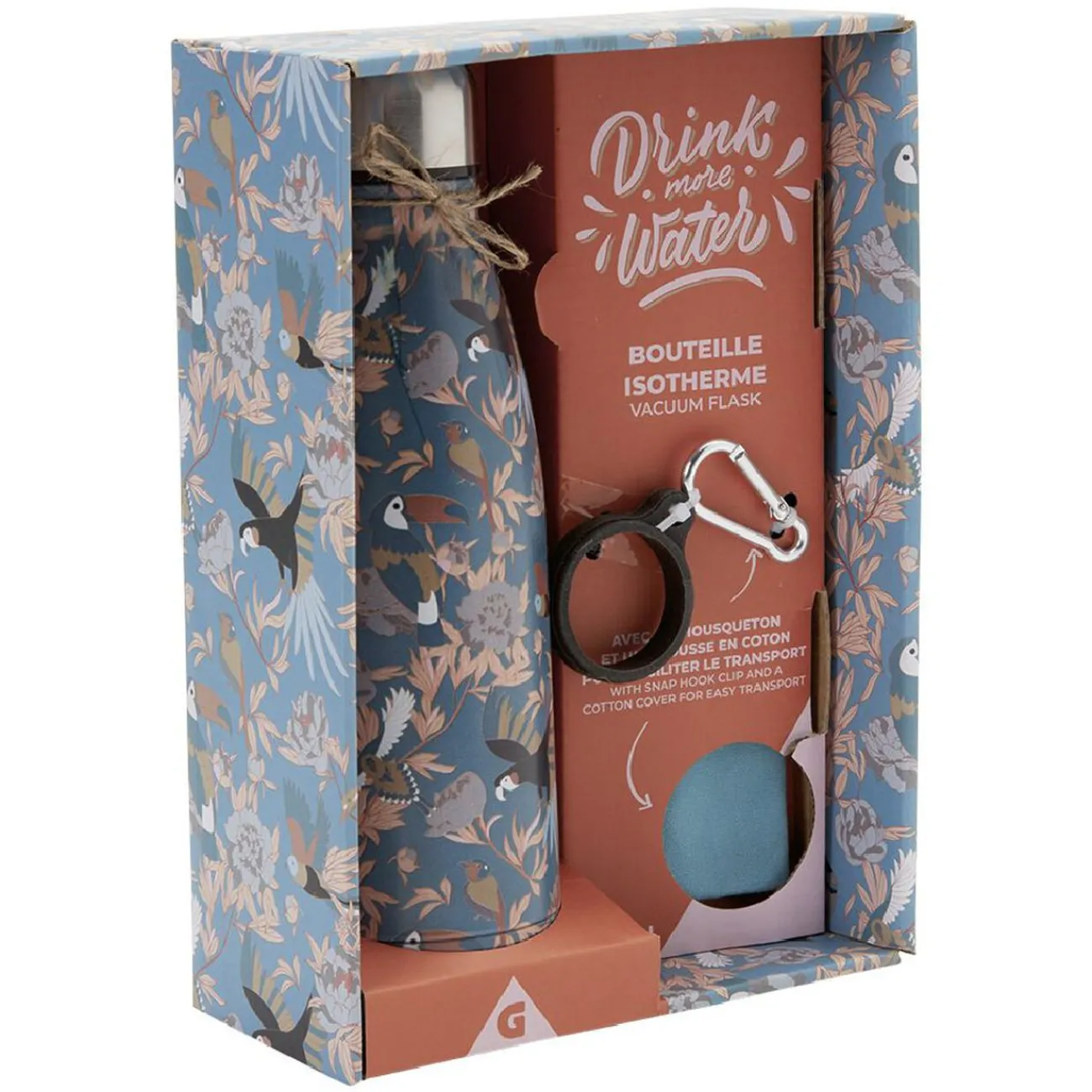 Munie d’un mousqueton et d’une housse en coton, cette bouteille sera facile à ranger et transporter.