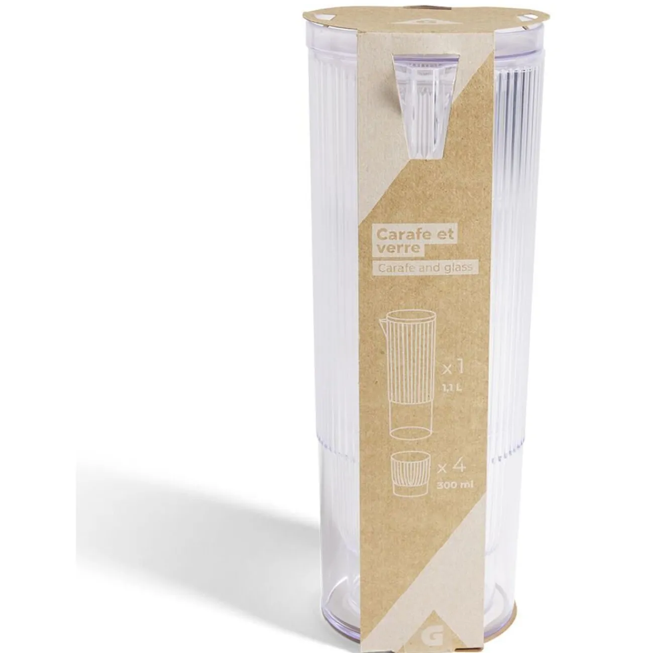 Cette carafe d’une capacité de 1,1 litre est accompagnée de quatre verres de 300 mL .