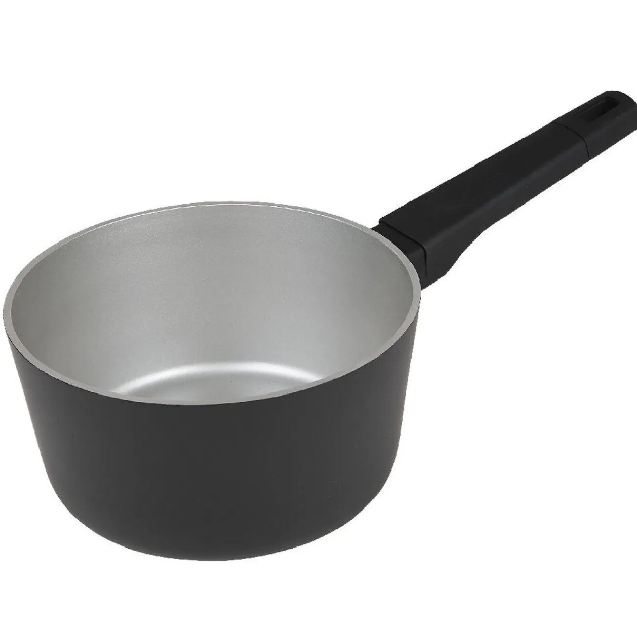 Casserole en aluminium avec revêtement anti-adhérent gris anthracite finition argentée et manche en plastique noir.