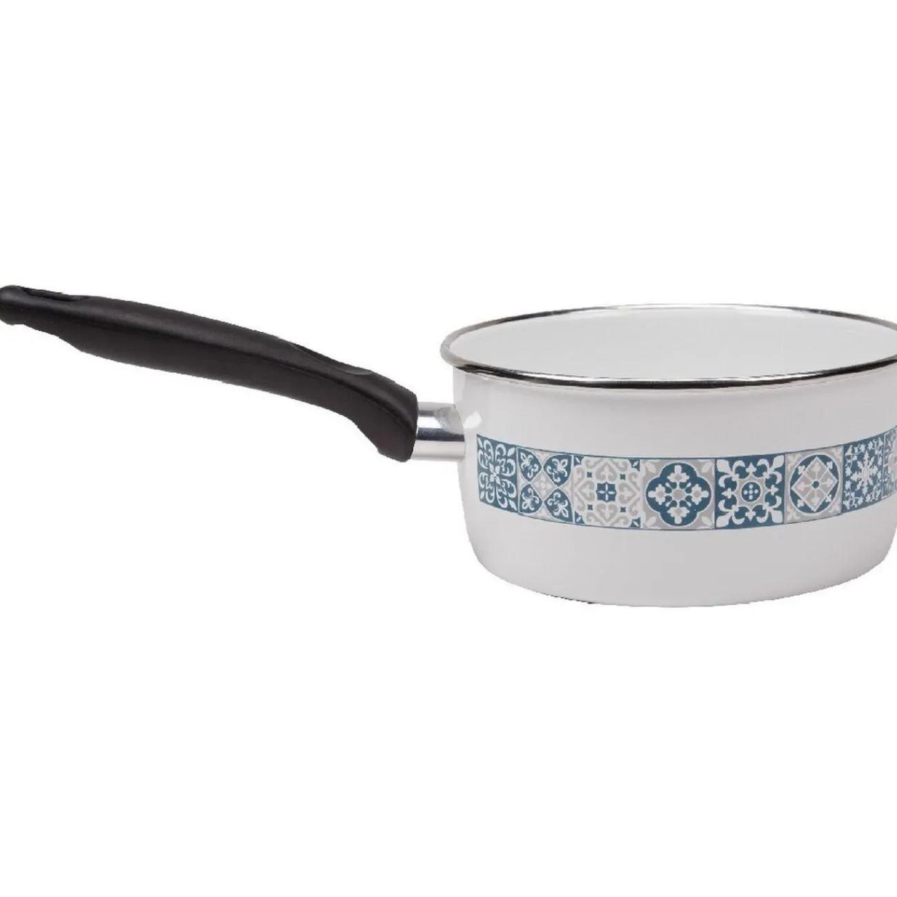 Casserole anti-adhésive en acier émaillé pour une cuisson plus sûre. Intérieur blanc avec exterieur blanc crème et motifs bleus.