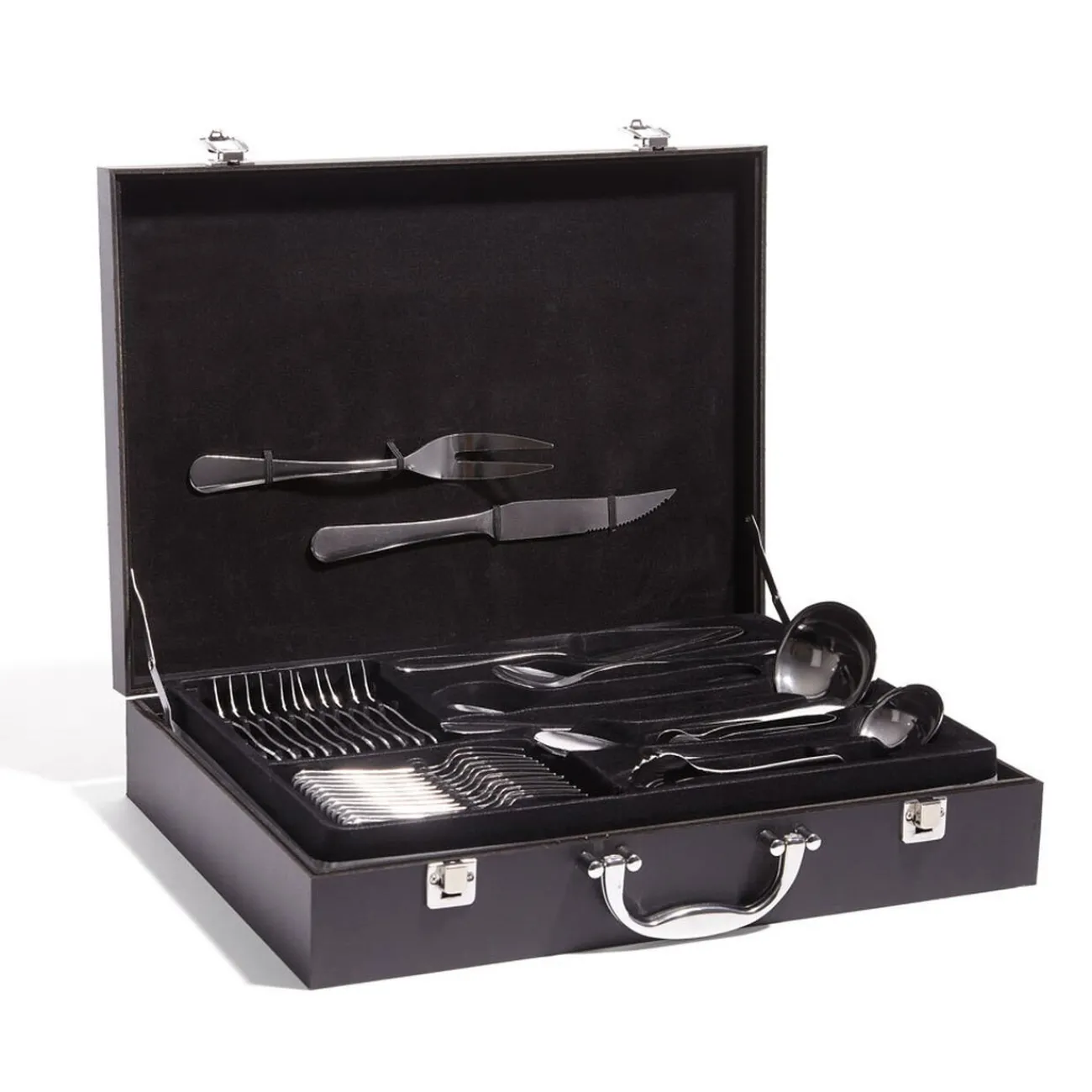 Ménagère 72 pièces en inox dans mallette noir MDF (panneau de fibres de bois) dim. 8,5x43x31 cm.