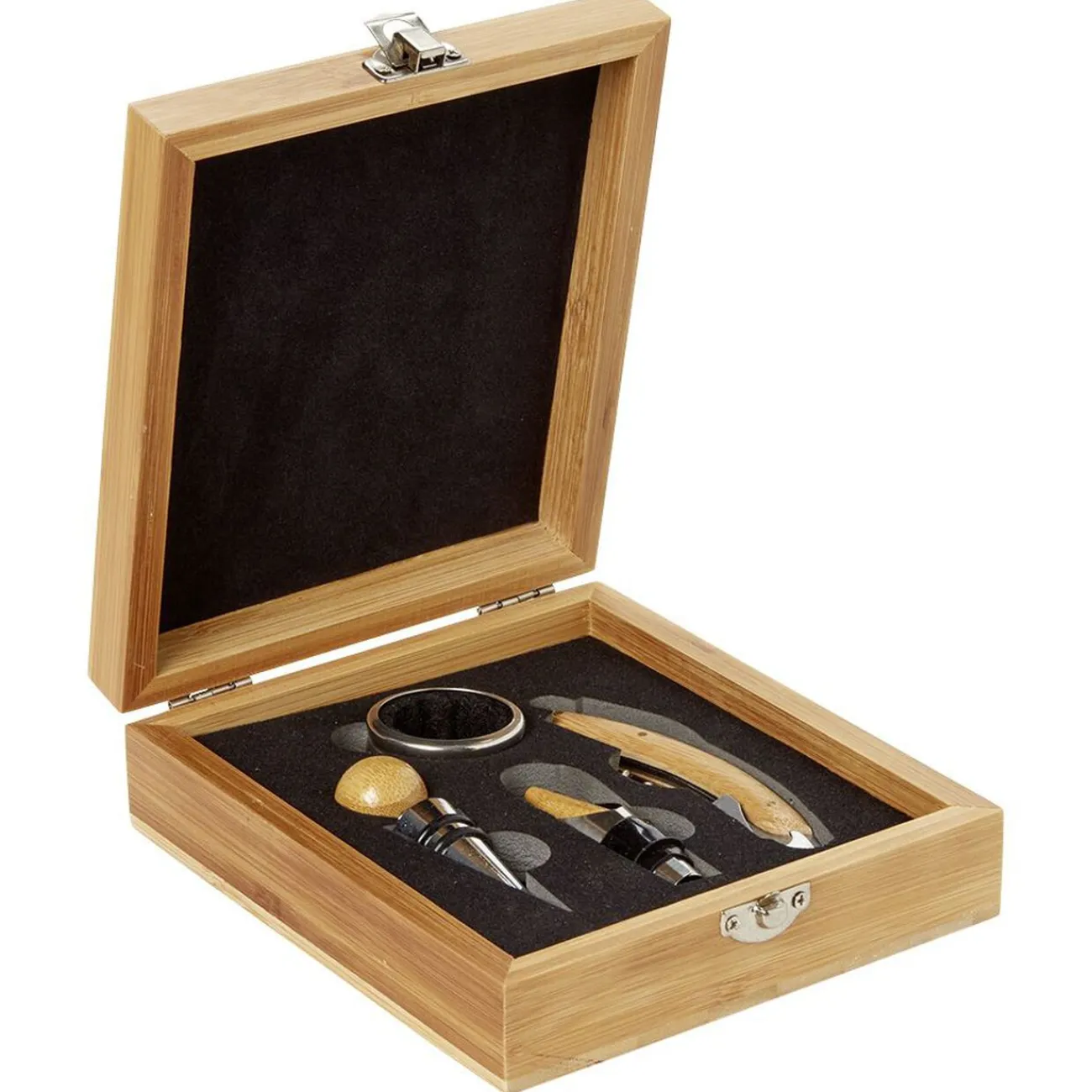 Coffret sommelier en bambou composé de 4 accessoires en inox pour déguster et servir le vin :