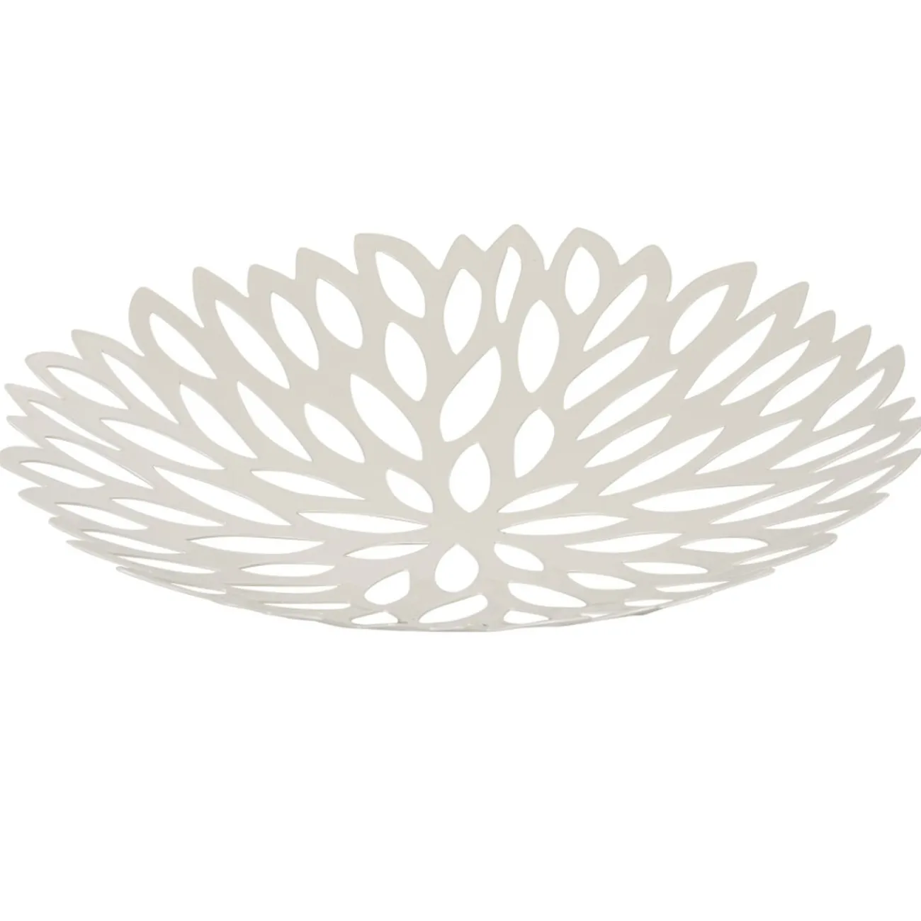 Elégante corbeille à fruits, en fer, de couleur blanc crème, en forme de fleur. Apporte une touche sereine à votre décoration de table.