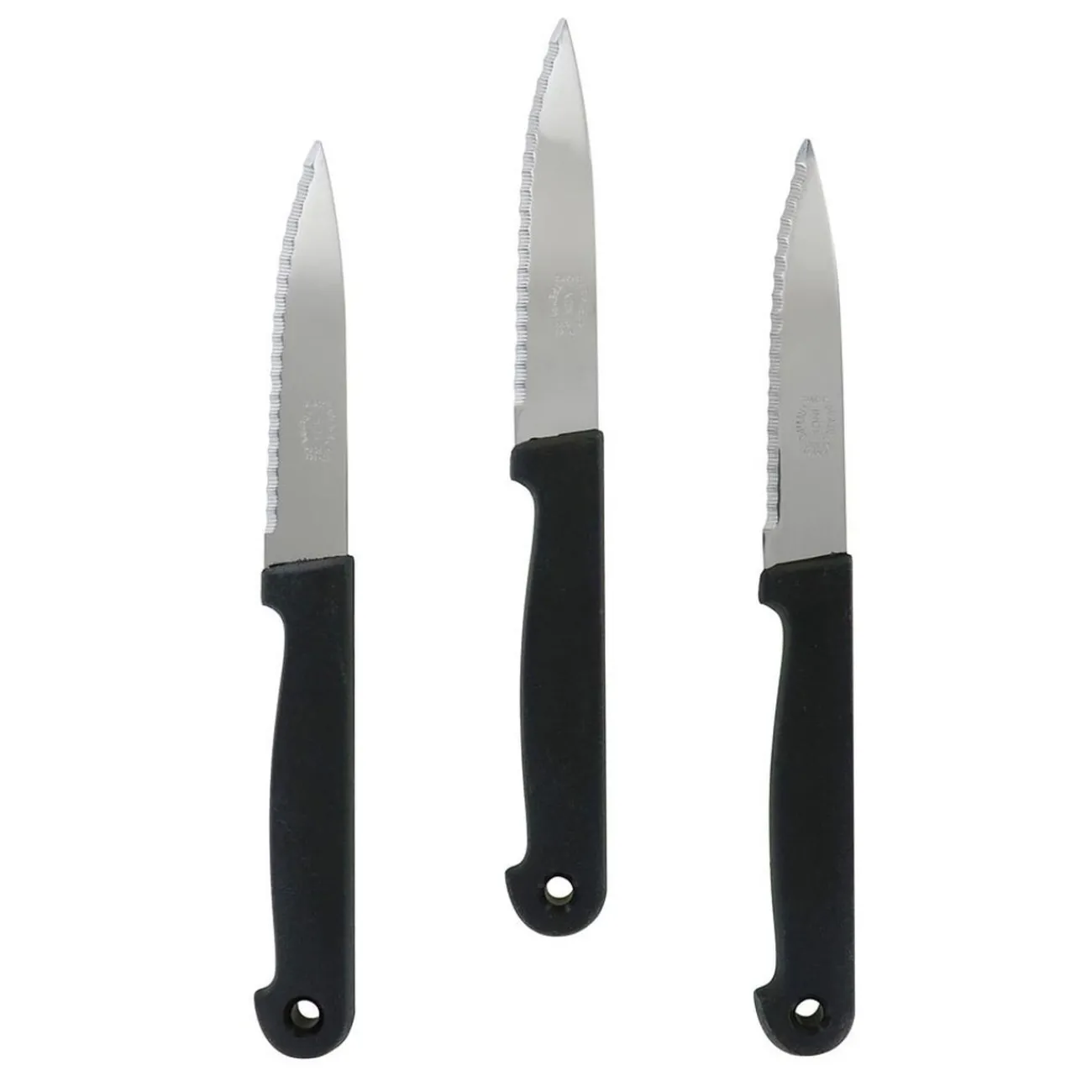 Lot de 3 couteaux à dents avec manche en plastique noir et lame en inox.