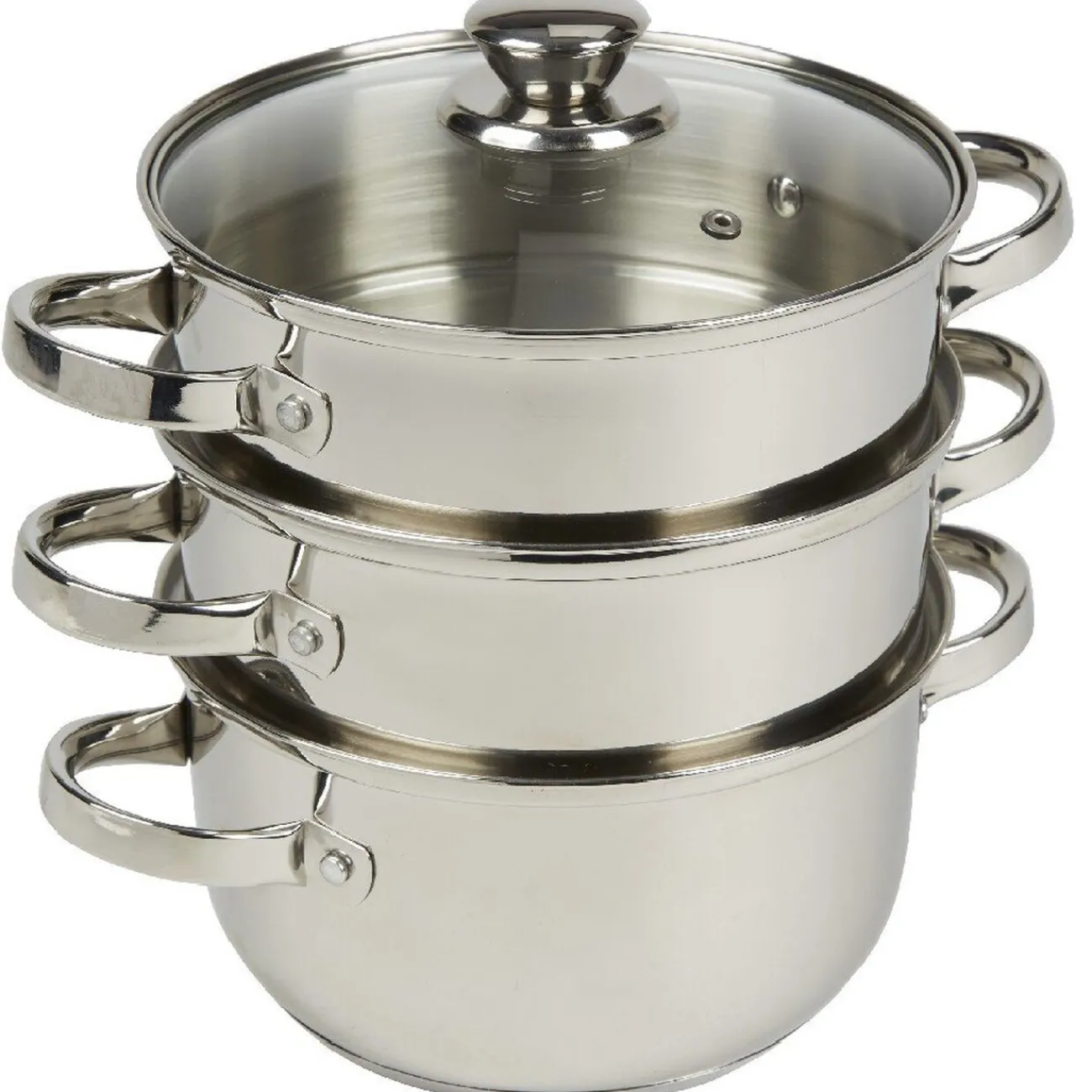 Cuisinez diététique de manière simple et rapide grâce à ce cuit-vapeur en acier inoxydable doté d’un faitout, de deux paniers et d’un couvercle.