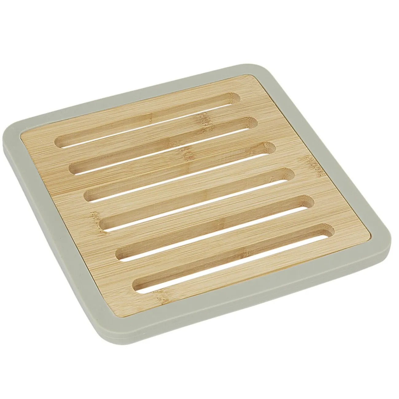 Dessous de plat en bambou naturel avec rainures pour laisser s’échapper la chaleur de vos plats et contour en silicone gris décoratif et antidérapant.