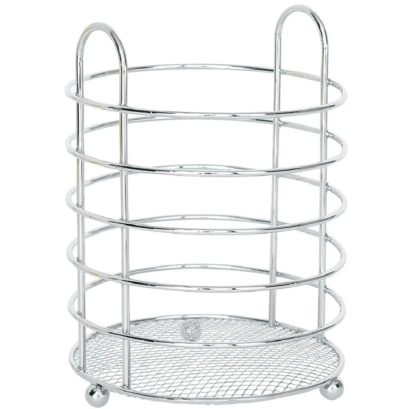 Egouttoir à couverts rond en métal chromé.