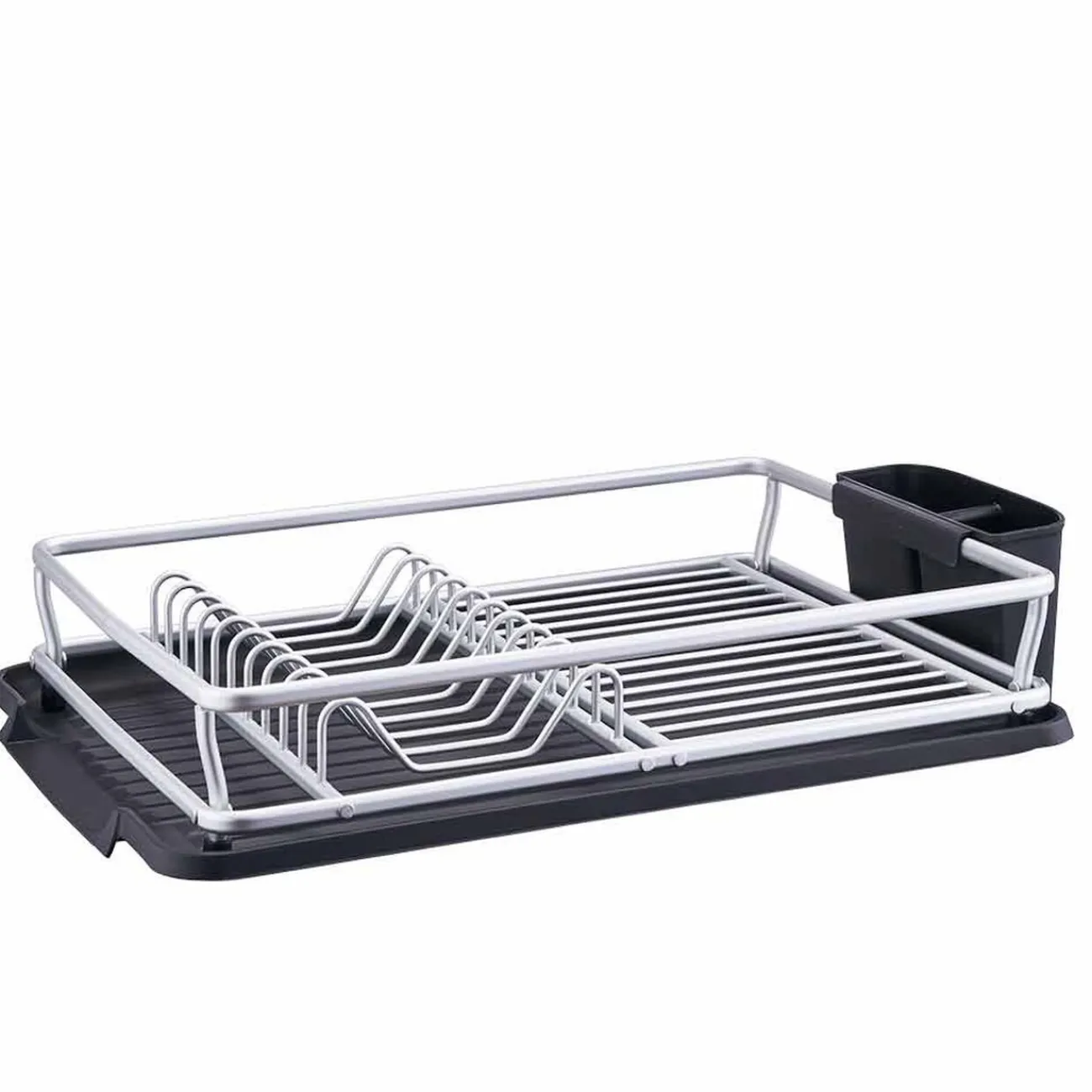 Égouttoir à vaisselle en aluminium avec porte-couverts et plateau récupérateur d’eau en plastique noir! Fonctionnel et design, ce modèle vous permettra de garder votre évier élégant et bien organisé