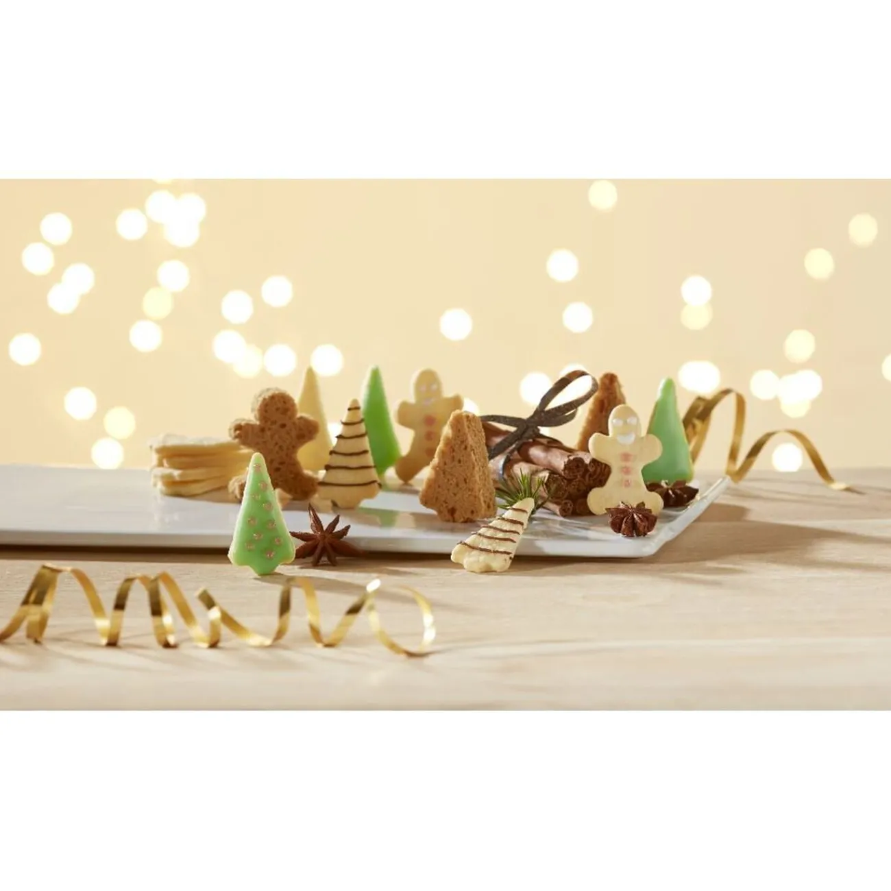 Emporte-pièce rouge contenant 2 formes de biscuits de Noël : sapin et bonhomme en pain d’épice, pour régaler vos convives durant les fêtes.