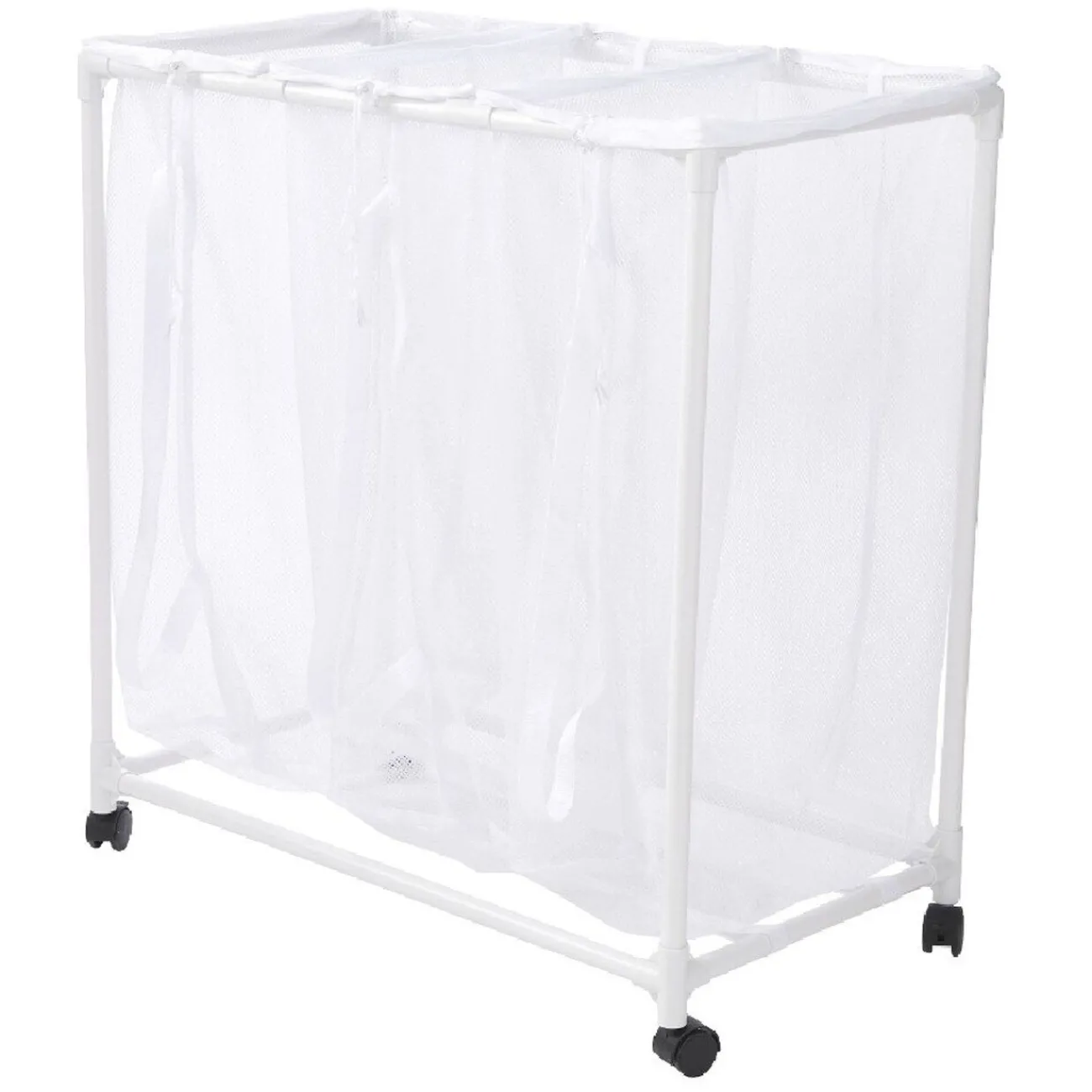 Ce chariot de buanderie équipé de 3 filets blancs avec anse sera idéal pour organiser le lavage de votre linge.