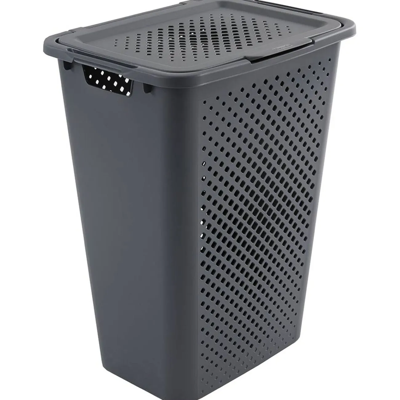 Coffre à linge en plastique uni gris et ajouré pour une ventilation optimale.