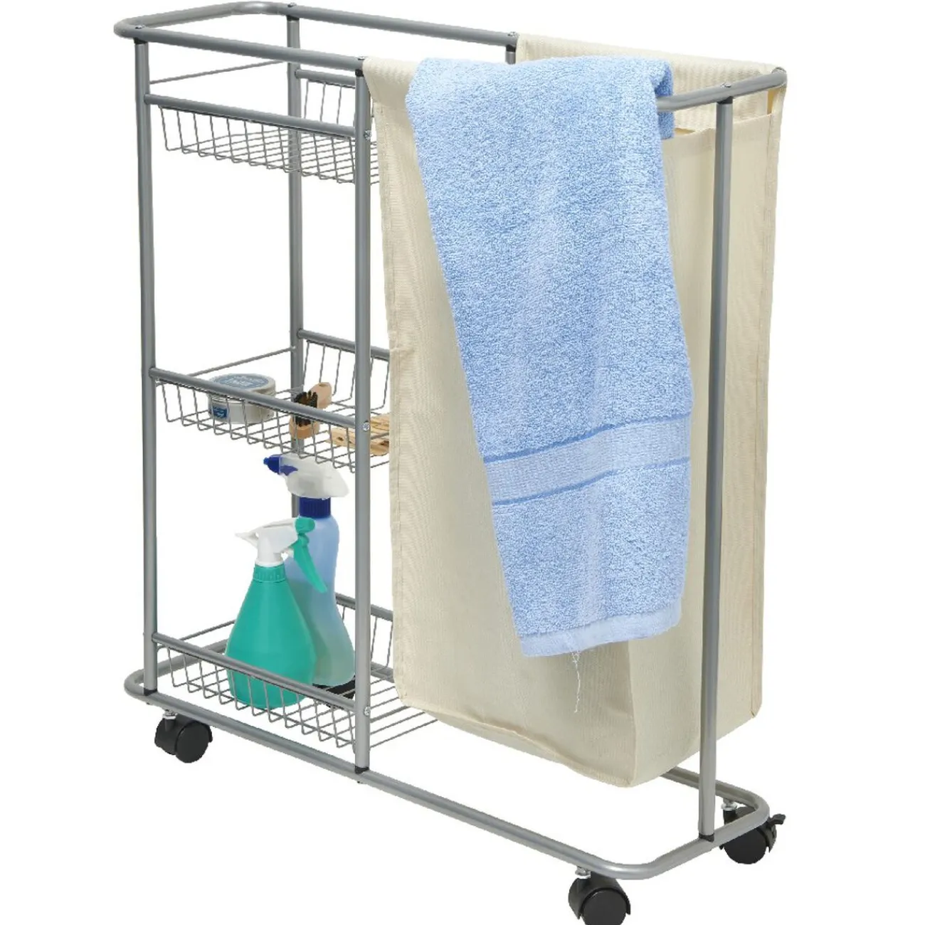 Desserte roulante dotée de 3 étagères en métal et d’un panier à linge.