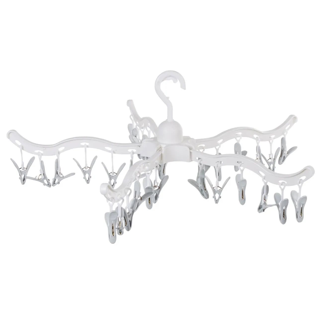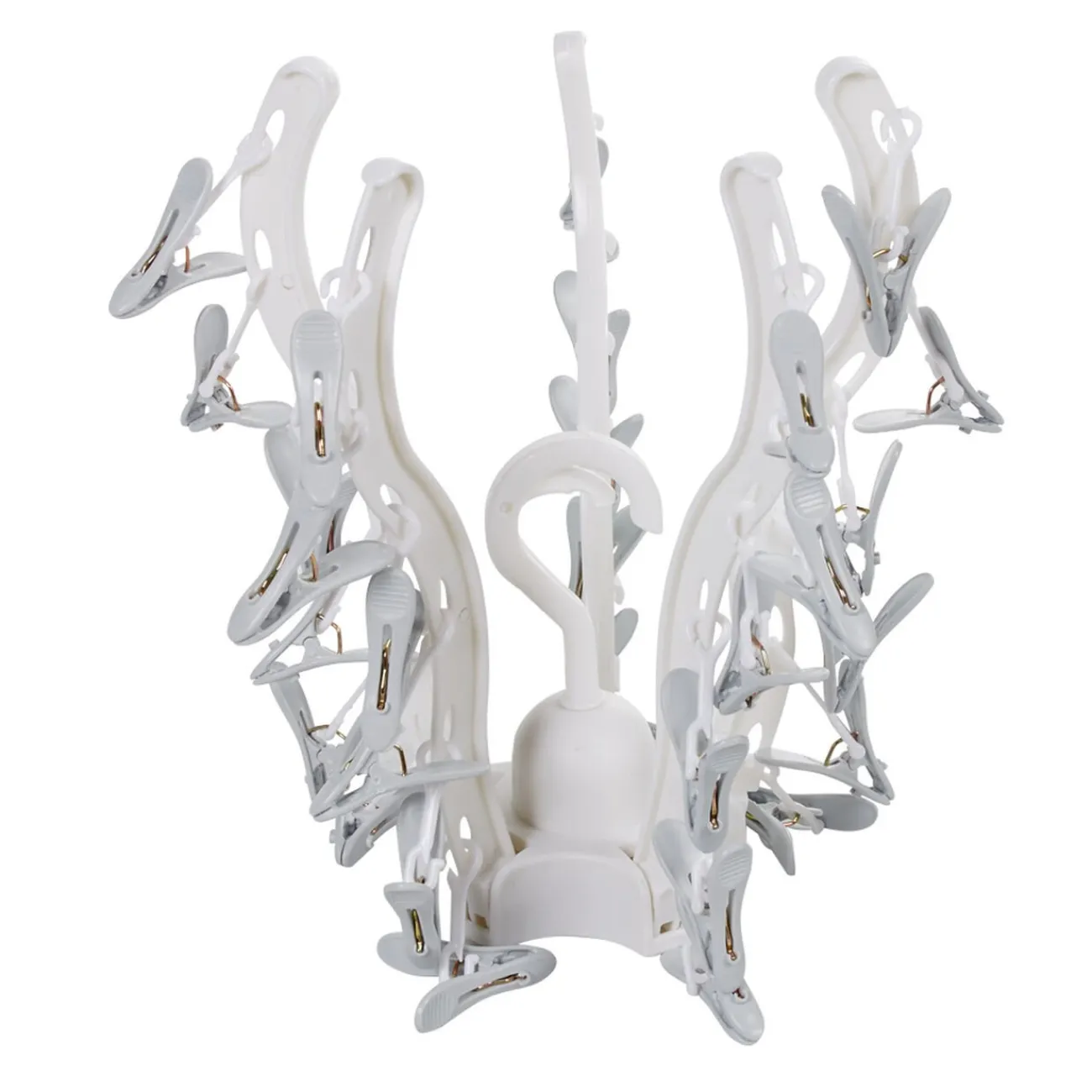 Séchoir à linge blanc avec 30 pinces accrochées.