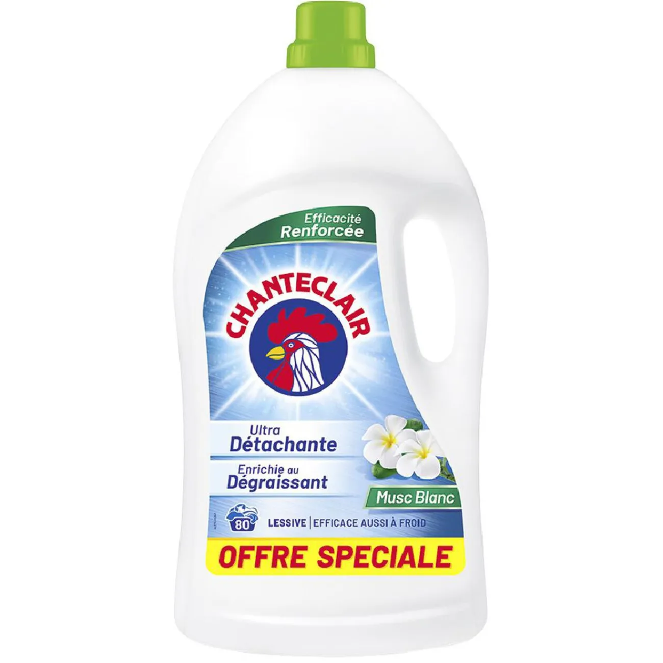 Lessive liquide Chanteclair hypoallergénique au parfum de musc blanc enbidon de 80 lavages.