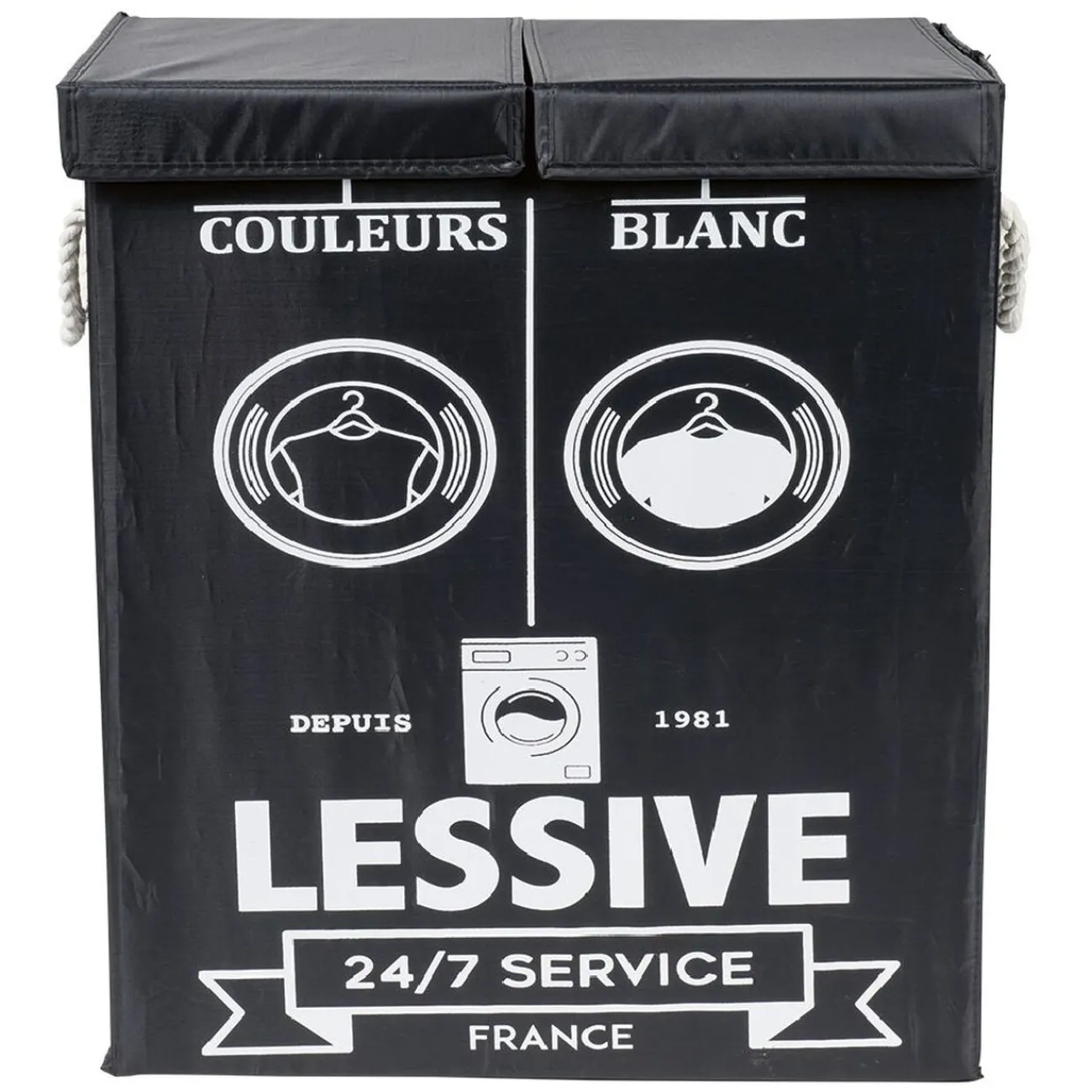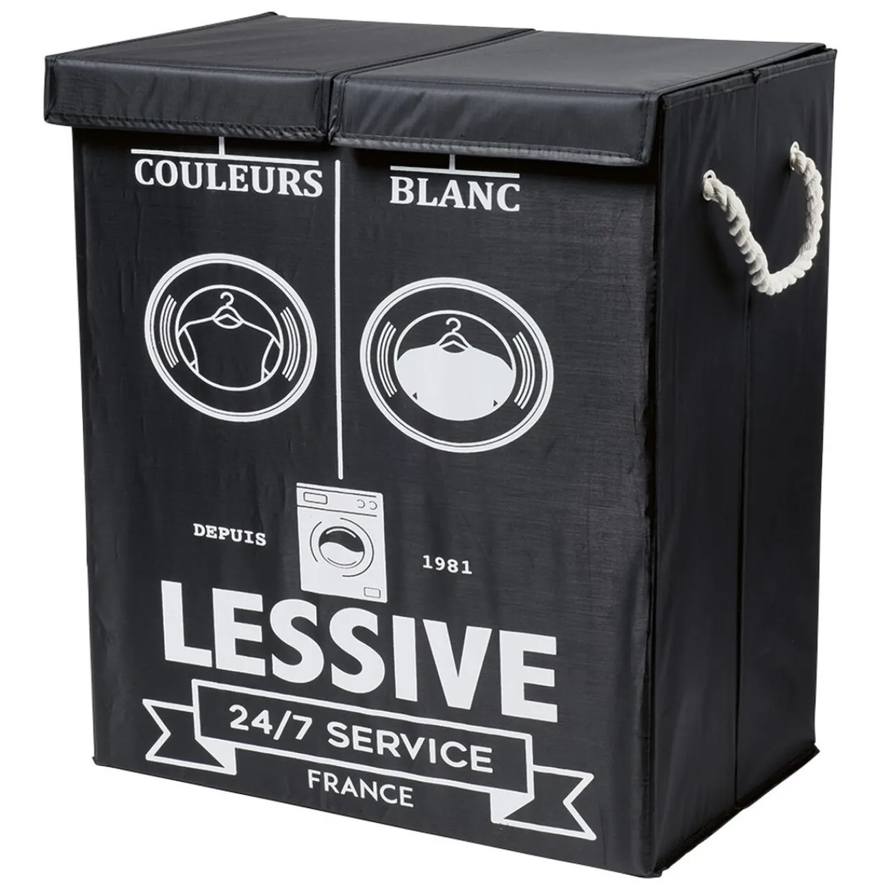 Panière à linge noire avec inscription blanche.