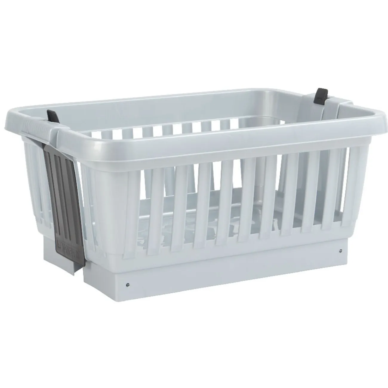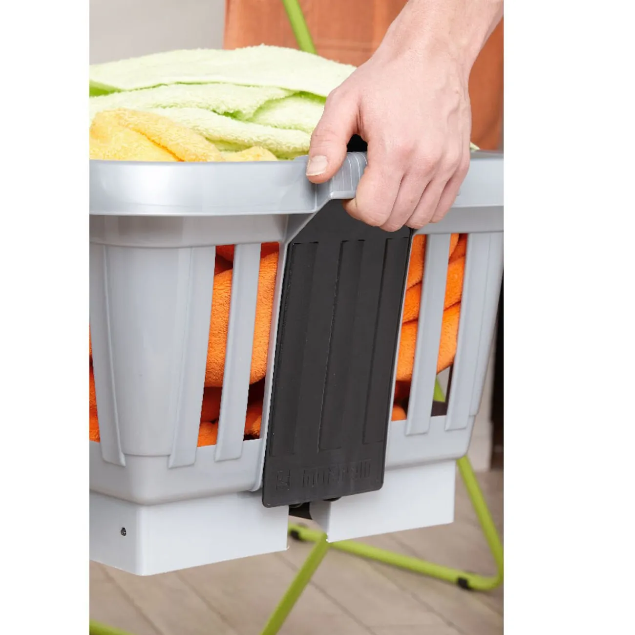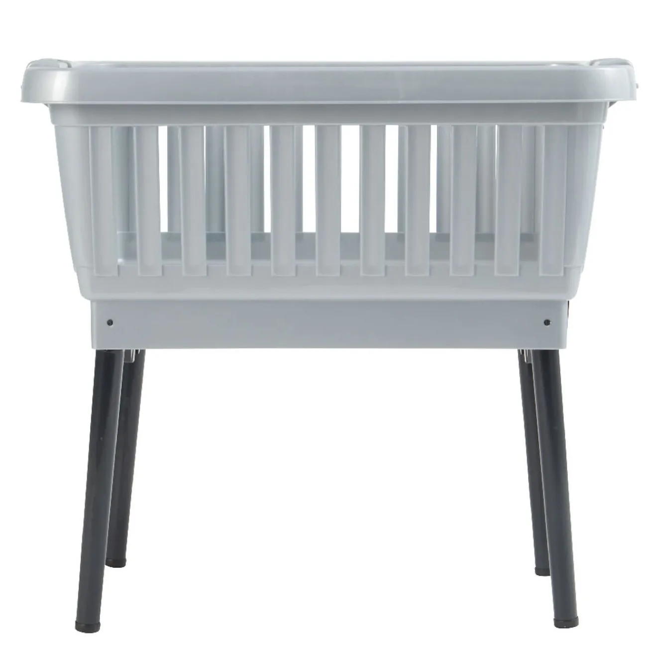 Panière grise sur pieds noirs, plus besoin de vous baisser les pieds se déploient d’une simple pression.