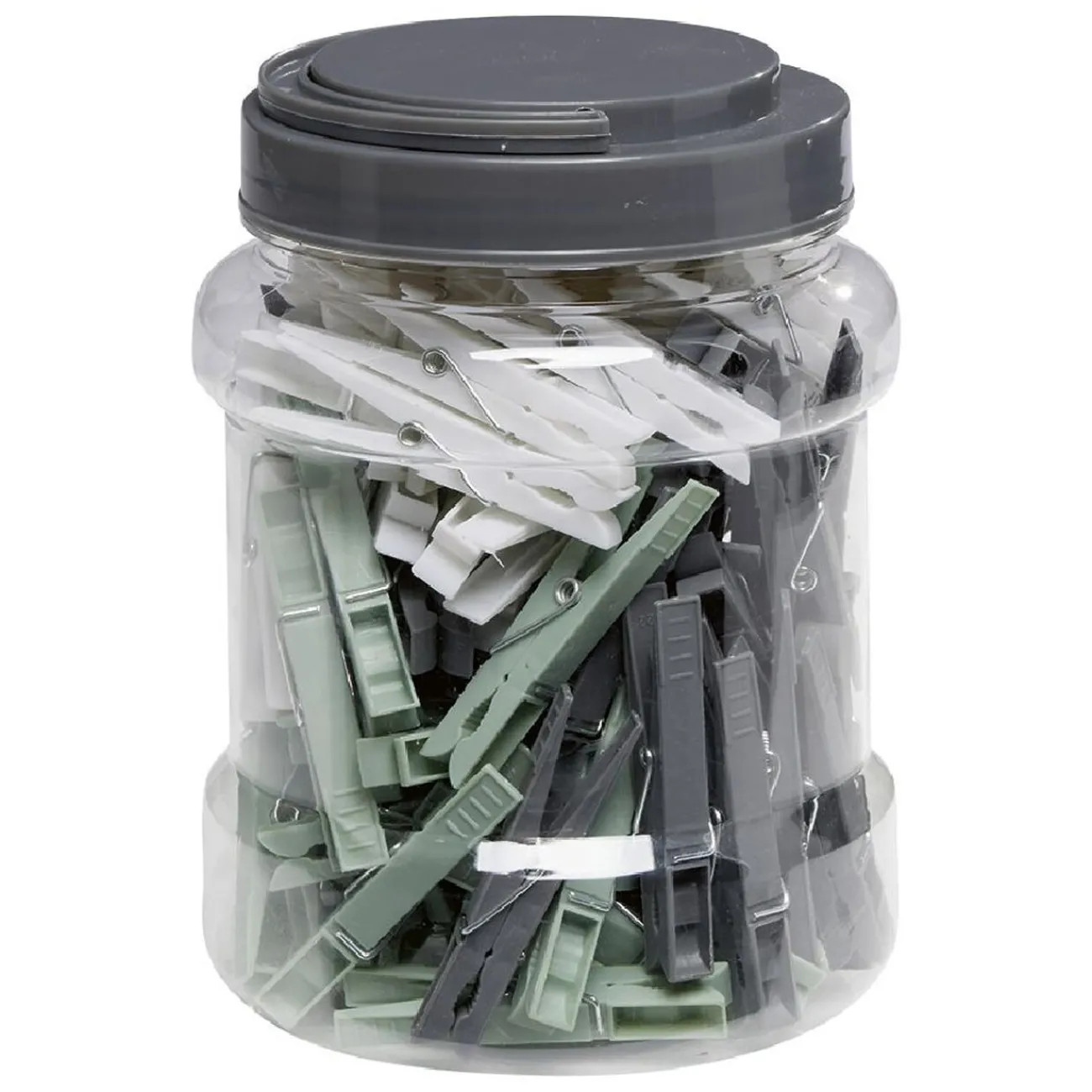 Bocal en plastique à suspendre avec 100 pinces à linge de couleur blanche, grise et verte.