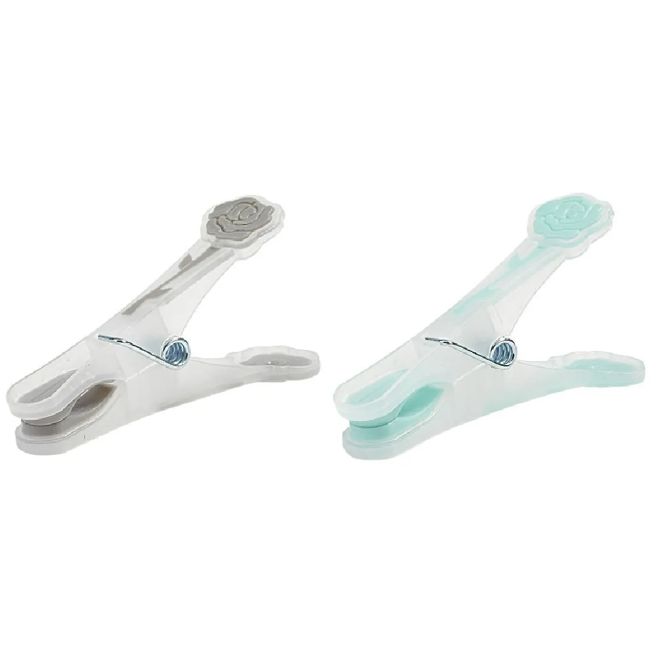 Lot de 24 pinces à linge dont 12 bleues transparentes et 12 grises transparentes.