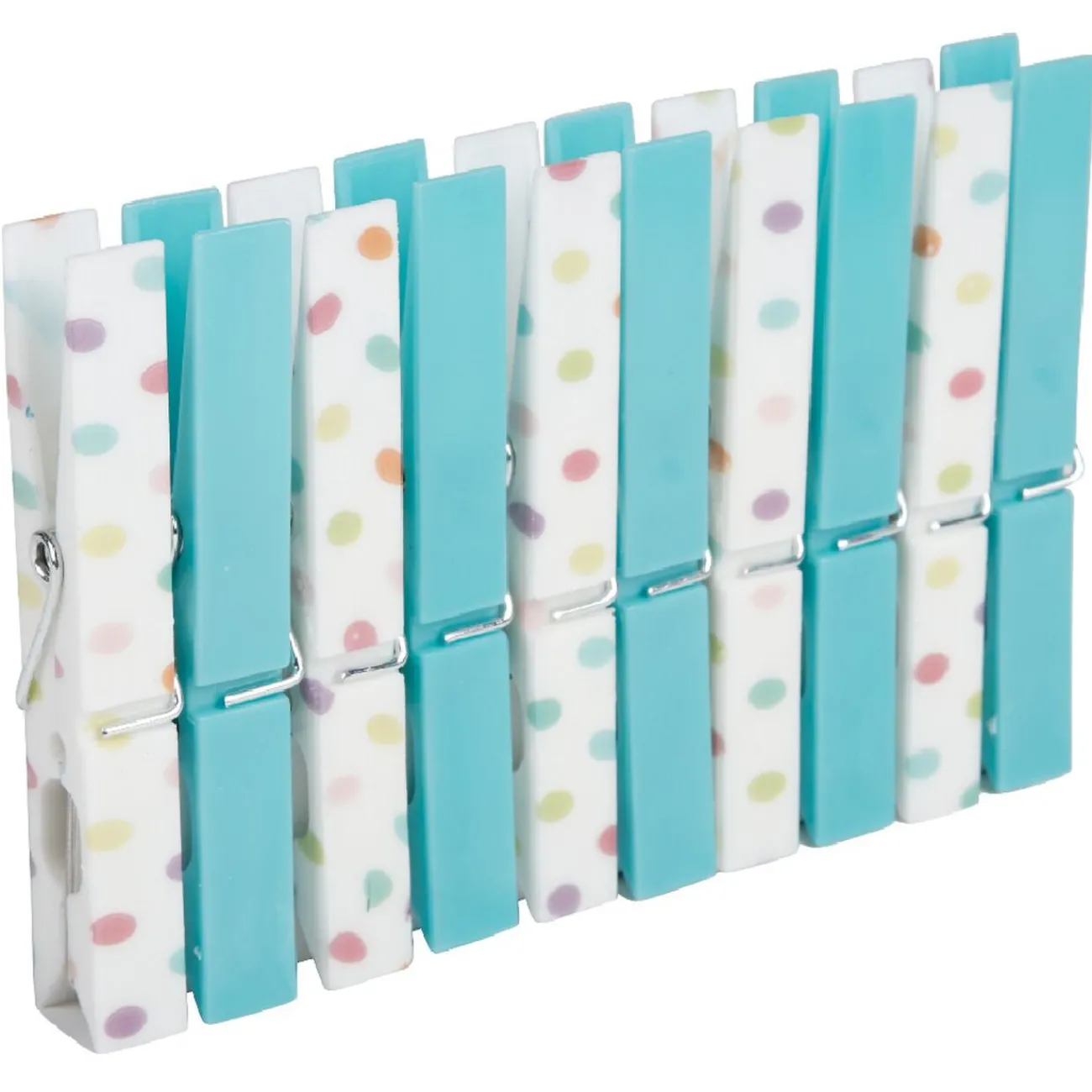 Lot de 10 pinces à linge dont 5 blanches avec motifs pois multicolores et 5 autres bleues ou grises, selon arrivage.