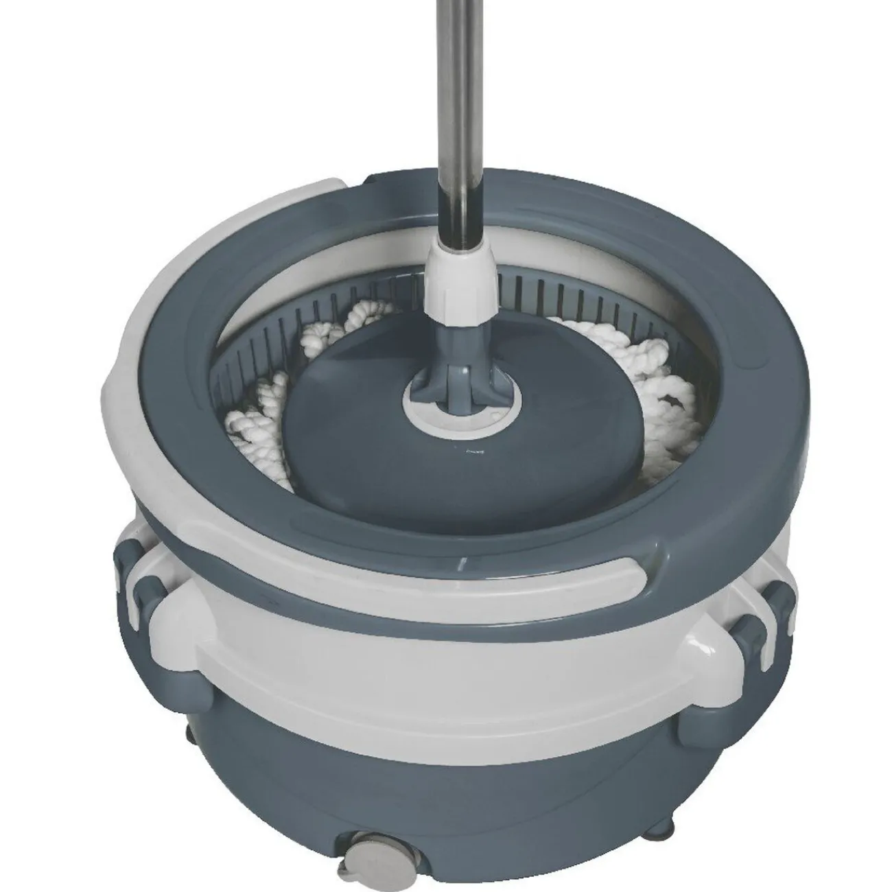 Seau essoreur rond avec balai rotatif blanc et gris, avec bouchon de vidange pour vider l’eau facilement.