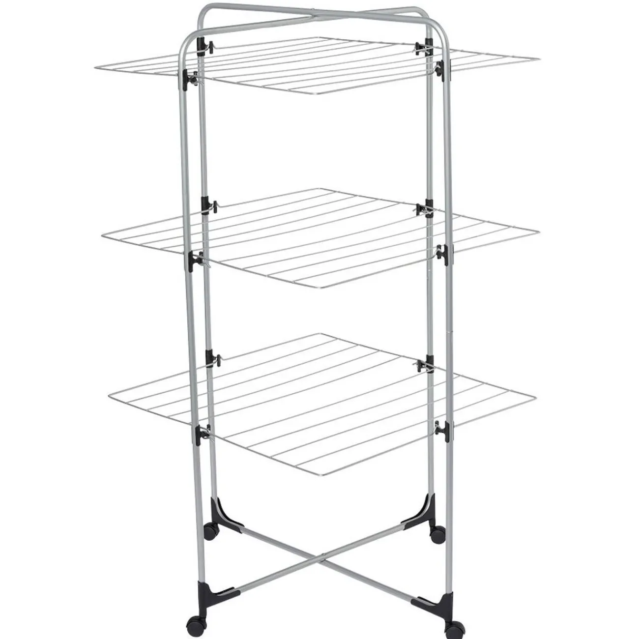Ce séchoir à 3 niveaux en métal et plastique gris est pliable et livré avec des roulettes pour pouvoir le déplacer et le ranger aisément après chaque utilisation.