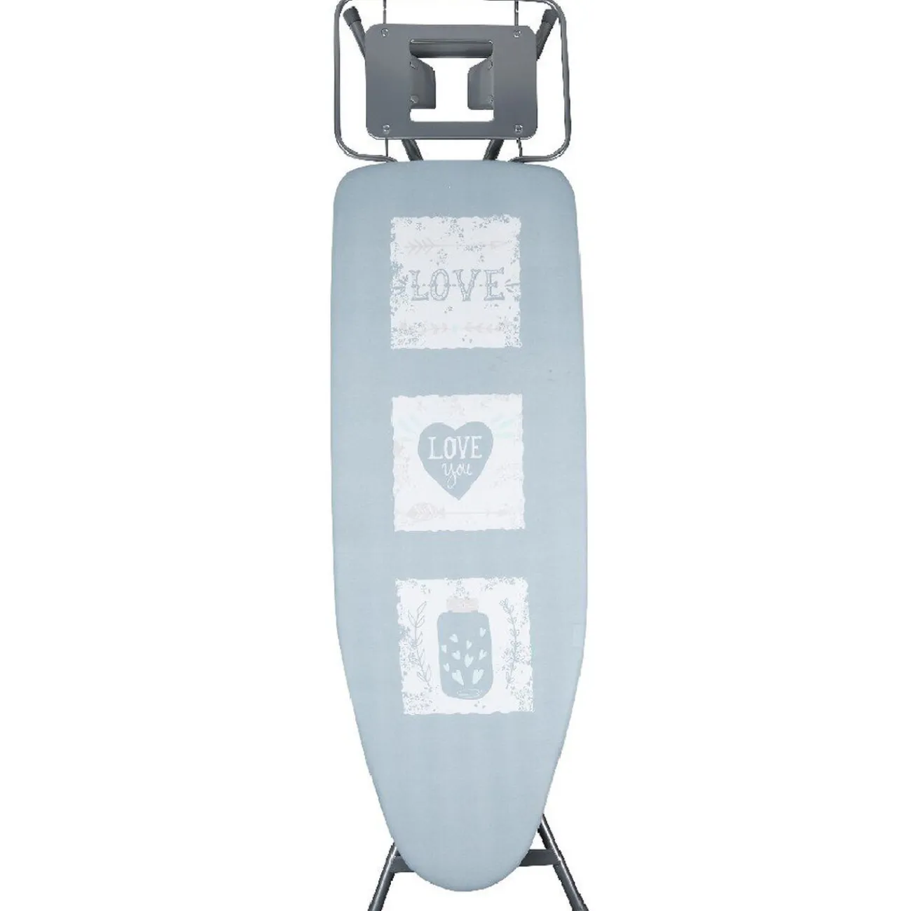 Table à repasser de couleur bleu et blanc motif coeur et avec inscription « Love ».
