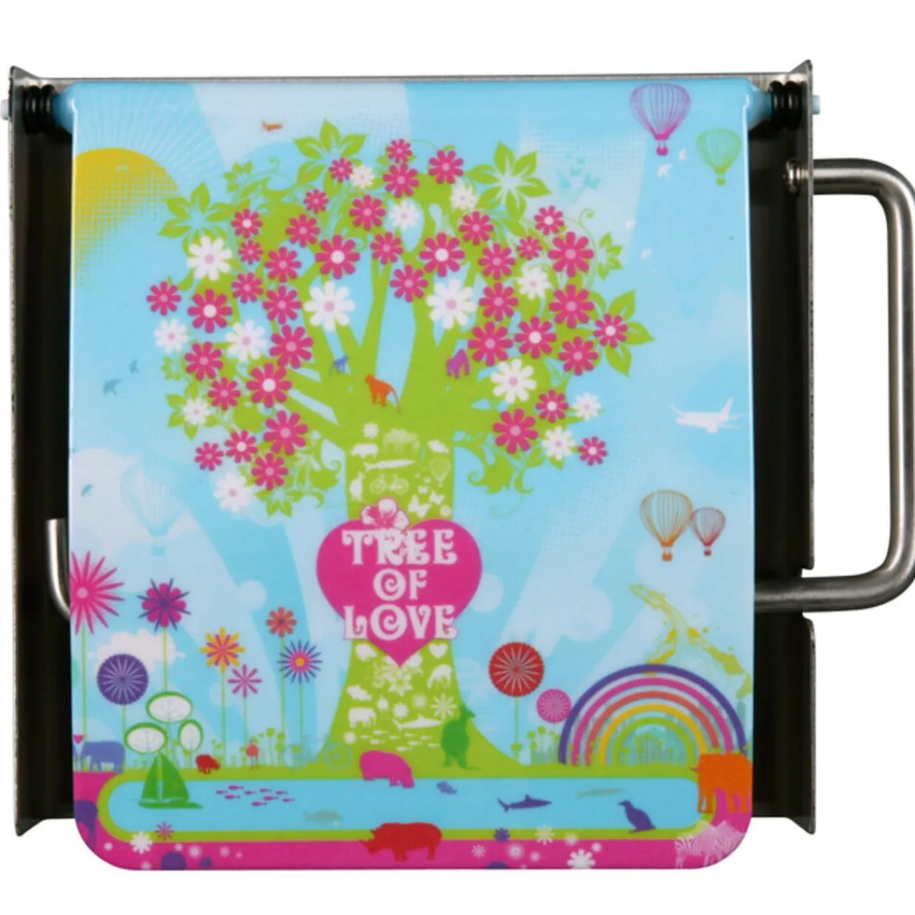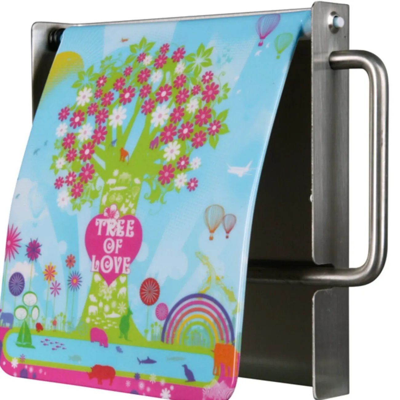 Dérouleur papier toilette « Tree of Love », inox et plastique mélaminé.