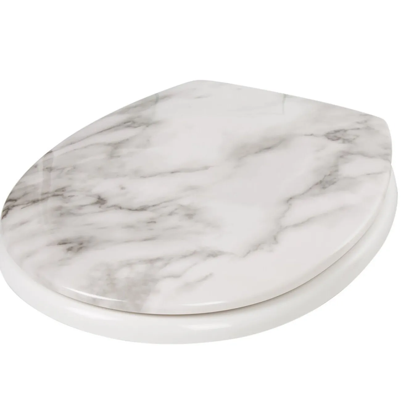 Abattant WC avec impression style marbre gris et blanc sur l’extérieur et de couleur blanc uni à l’intérieur.