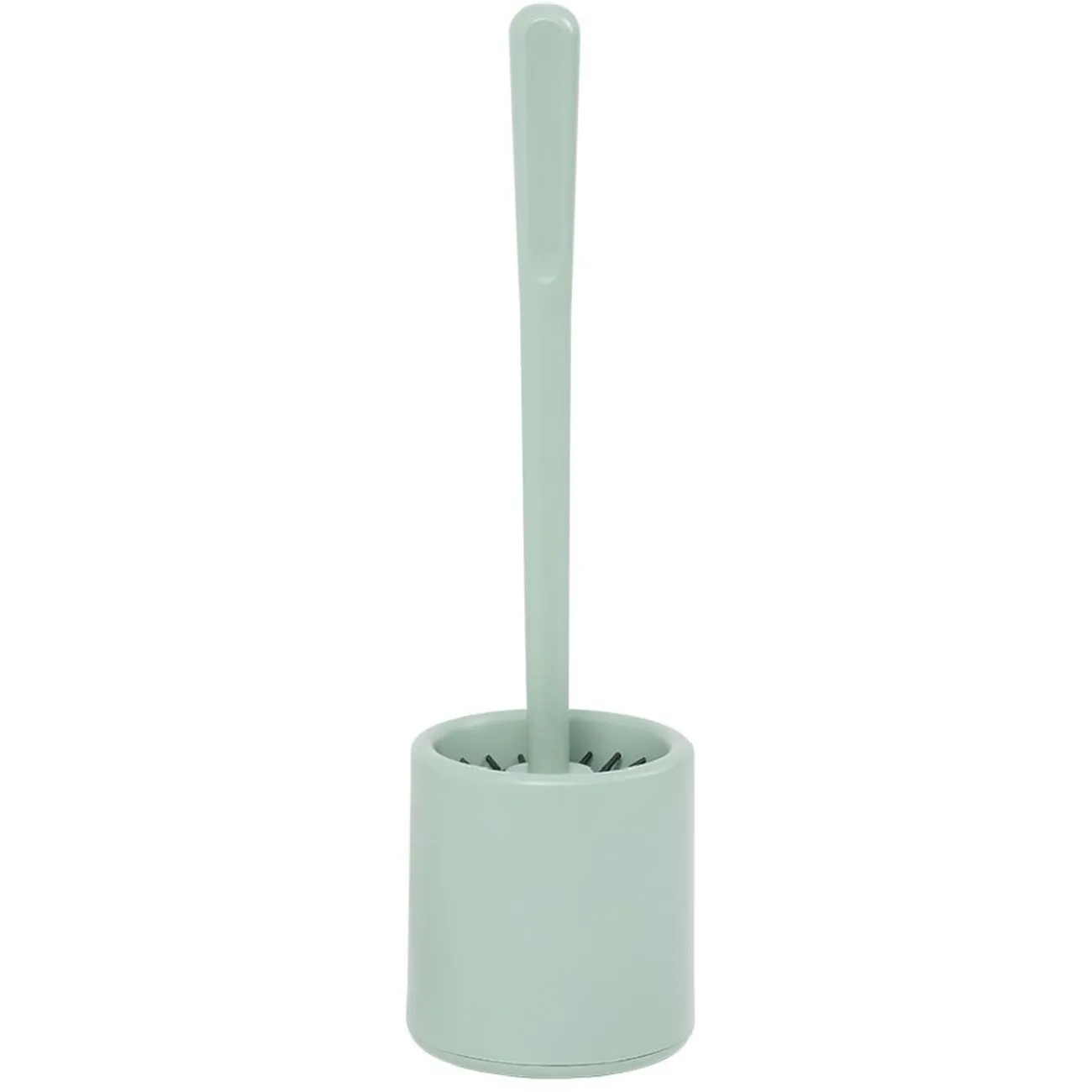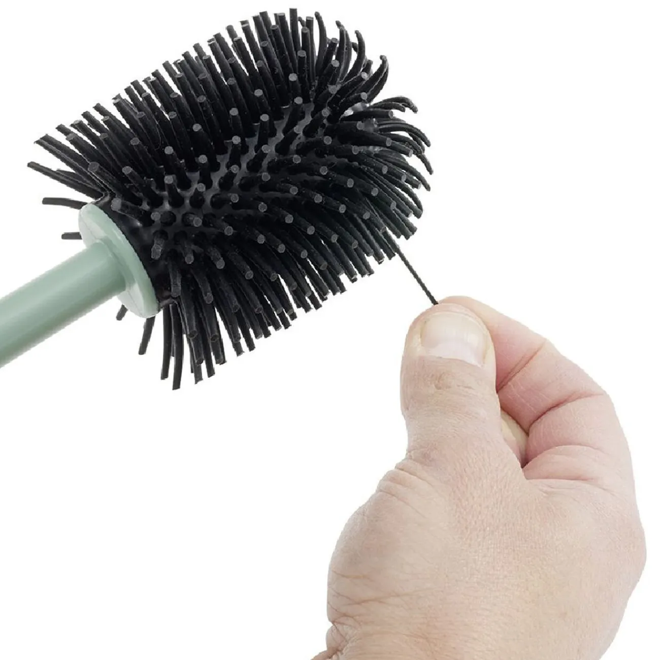 Brosse à WC avec tête en silicone noir et support en plastique vert.