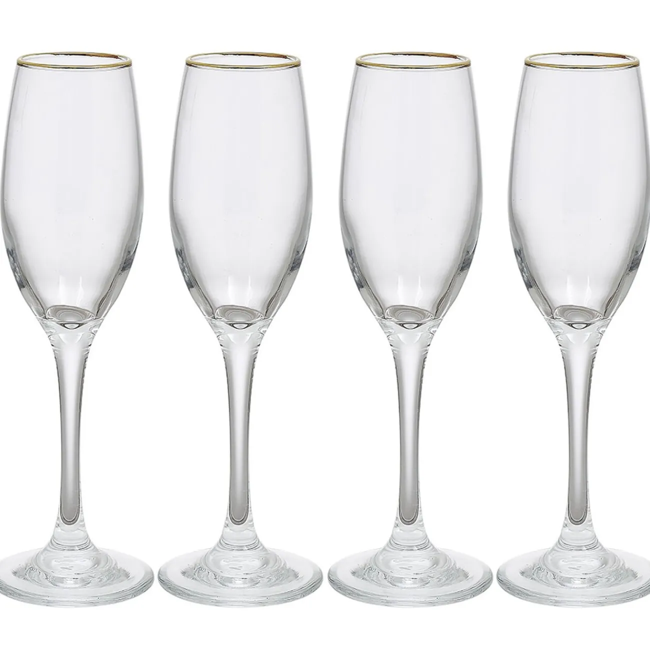 Lot de 4 flûtes en verre transparent avec liseré doré sur le bord.