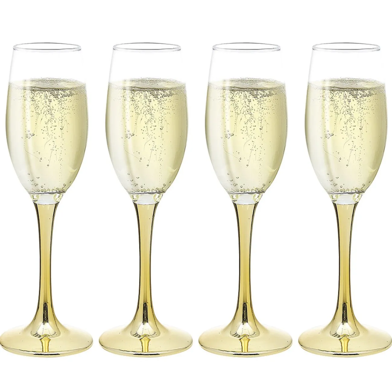 Lot de 4 flûtes en verre transparent avec pied de couleur doré.