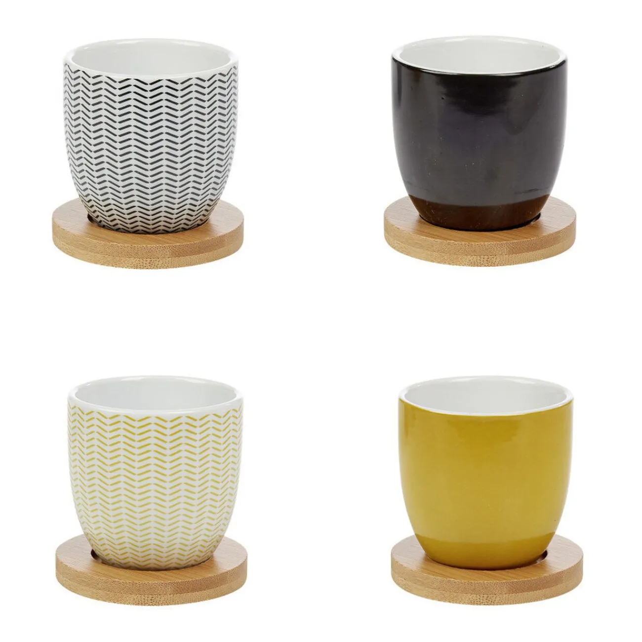 Ensemble de 4 gobelets à expresso en porcelaine multicolore et sous-tasses en bambou. Ce set au design multicolore apportera une touche élégante et moderne à vos pauses cafés!