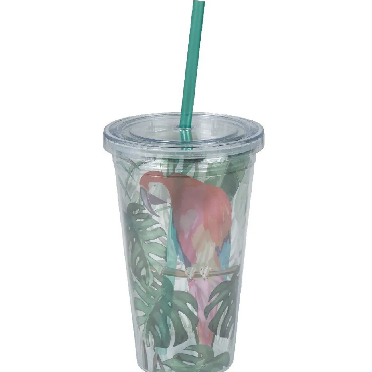 Complétez votre déco de table exotique avec ce gobelet multicolore en plastique avec paille incluse. Motif exotique avec perroquet et feuillage.
