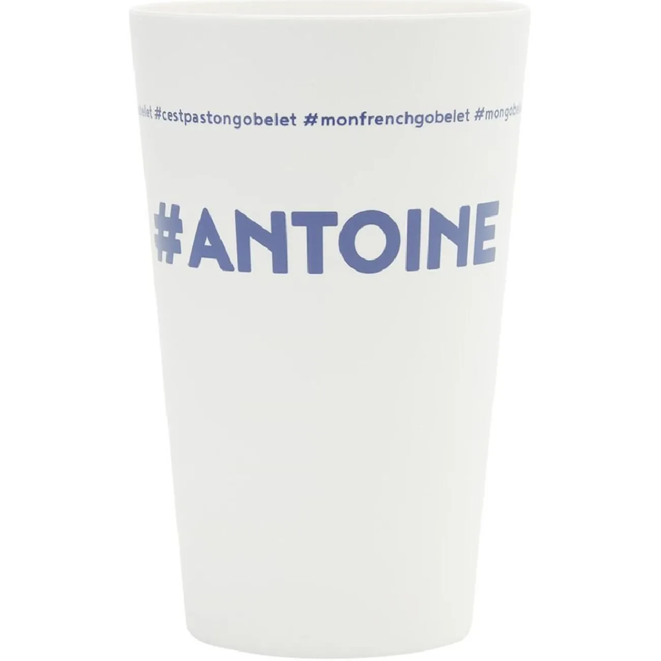 Gobelet réutilisable en plastique blanc avec inscription bleue #ANTOINE.