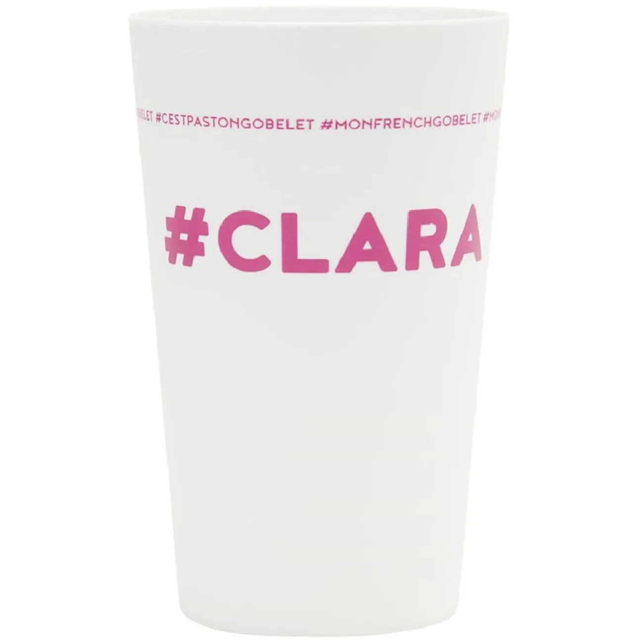 Gobelet réutilisable en plastique blanc avec inscription rose #CLARA.