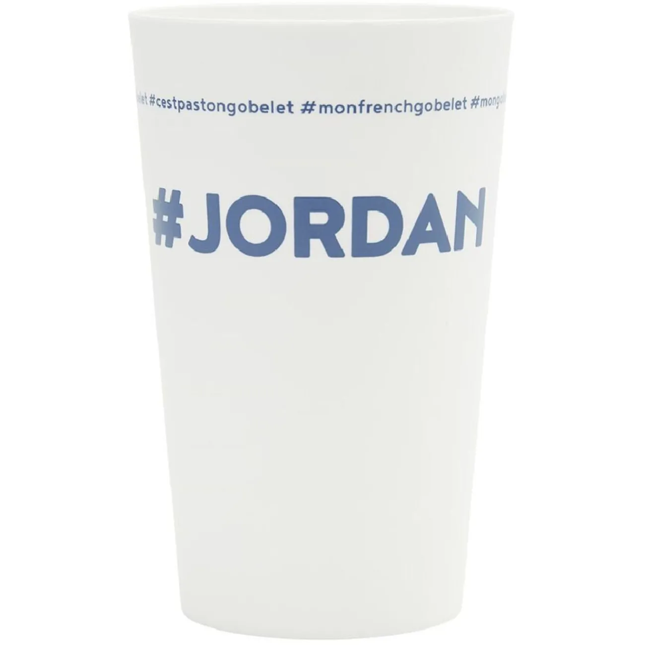 Gobelet réutilisable en plastique blanc avec inscription bleue #JORDAN.