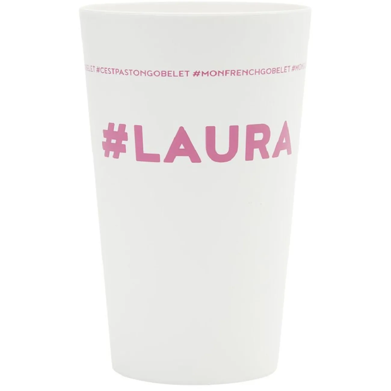 Gobelet réutilisable en plastique blanc avec inscription rose #LAURA.