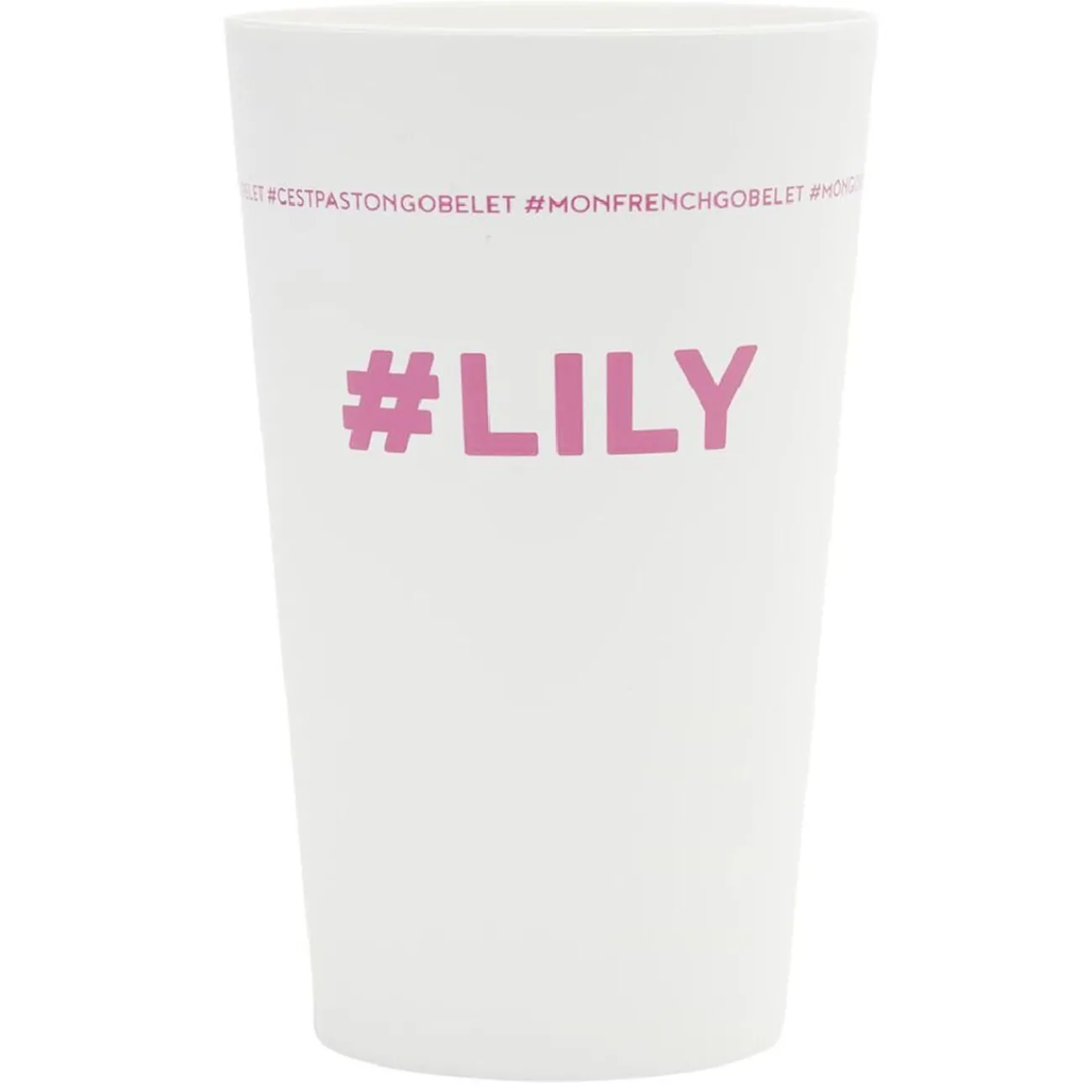 Gobelet réutilisable en plastique blanc avec inscription rose #LILY.