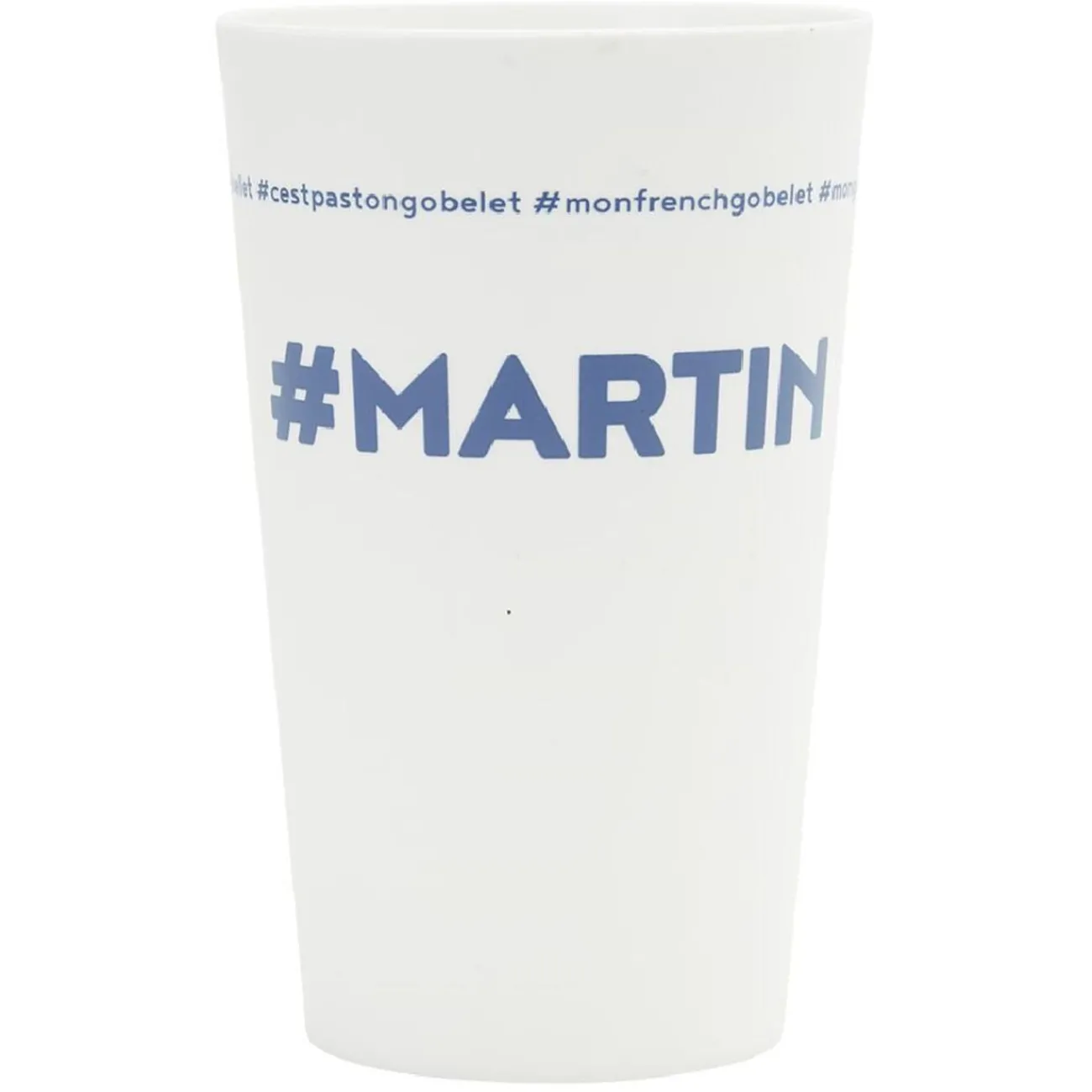 Gobelet réutilisable en plastique blanc avec inscription bleu #MARTIN.