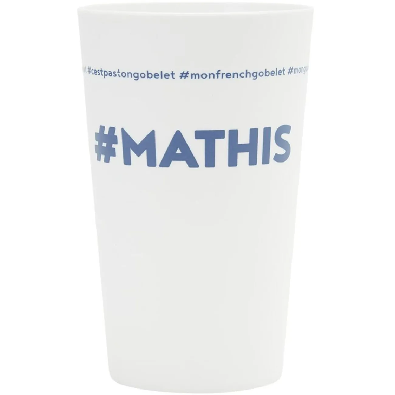 Gobelet réutilisable en plastique blanc avec inscription bleue #MATHIS.