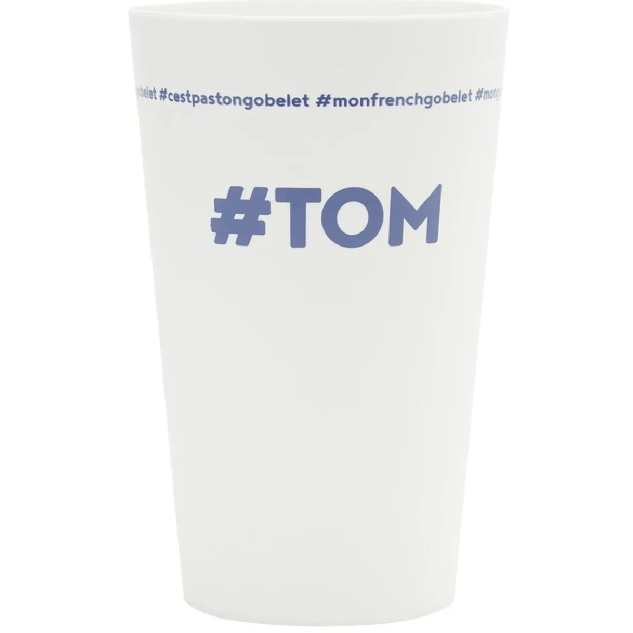Gobelet réutilisable en plastique blanc avec inscription bleue #TOM.