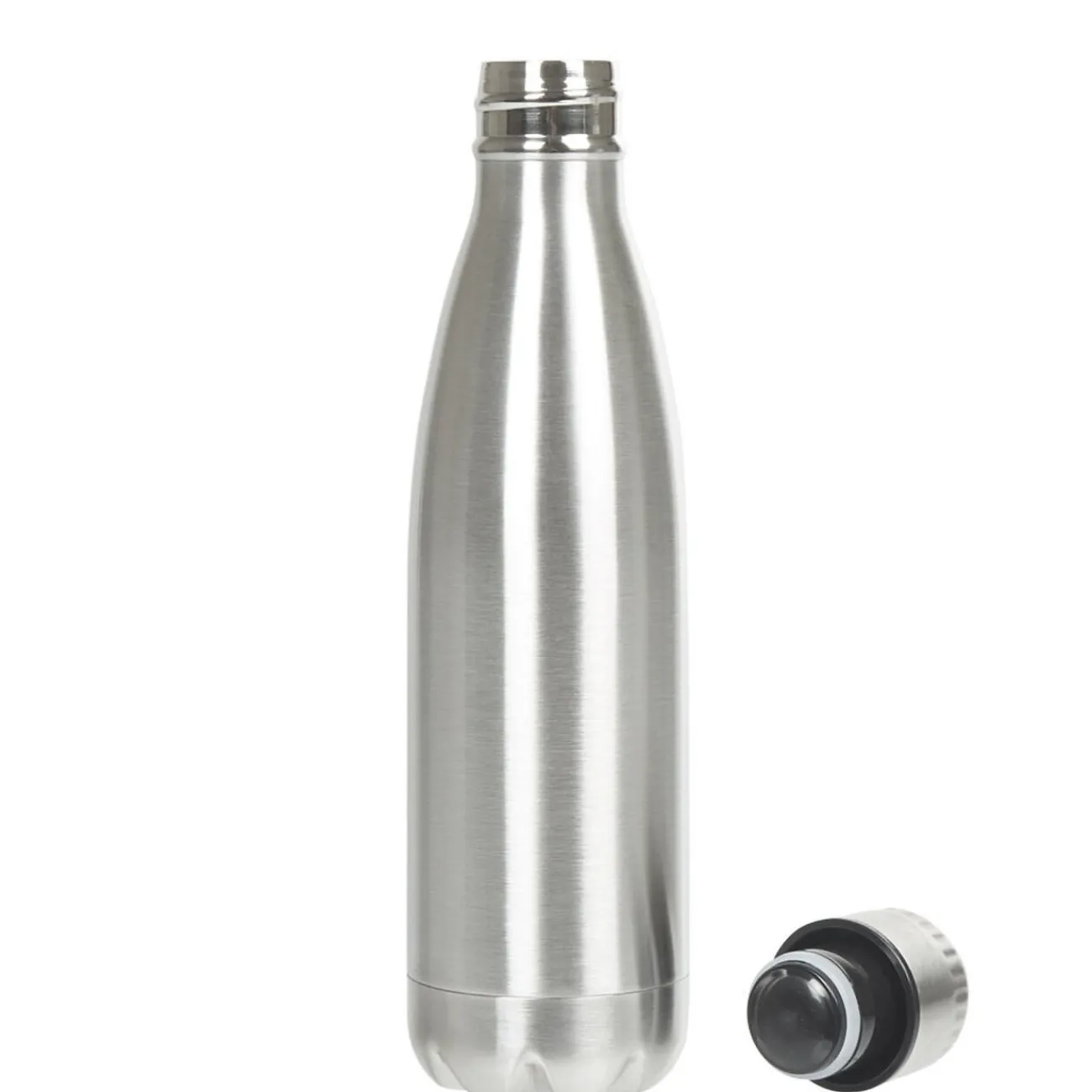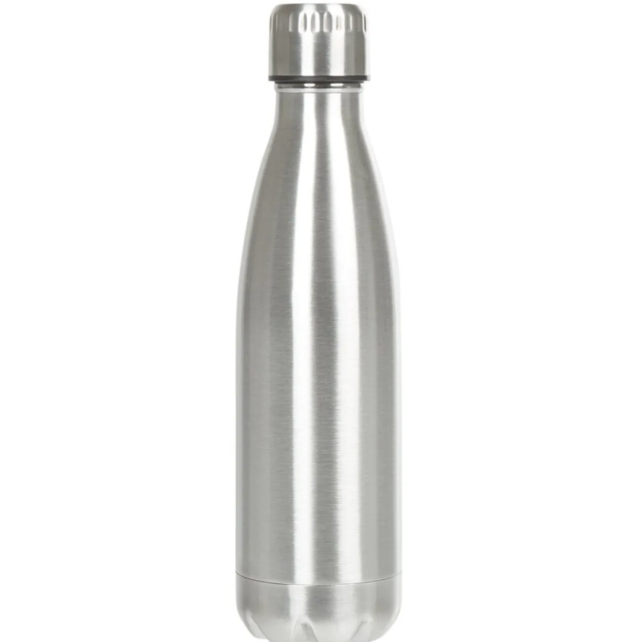 Gourde en forme de bouteille isotherme double paroi gris chromé.